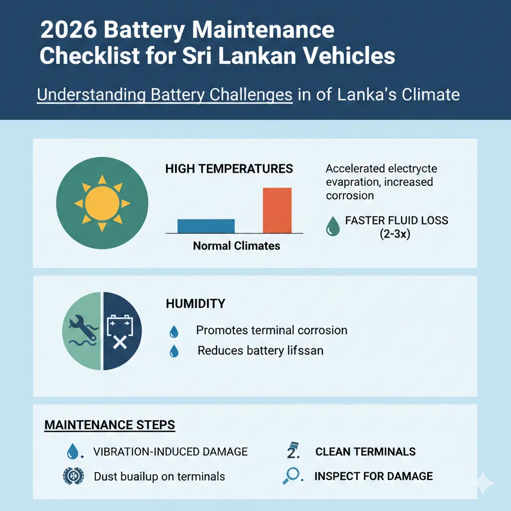 Comprehensive battery maintenance checklist for Sri Lankan vehicles. Learn how to prevent corrosion and extend battery life in tropical conditions.