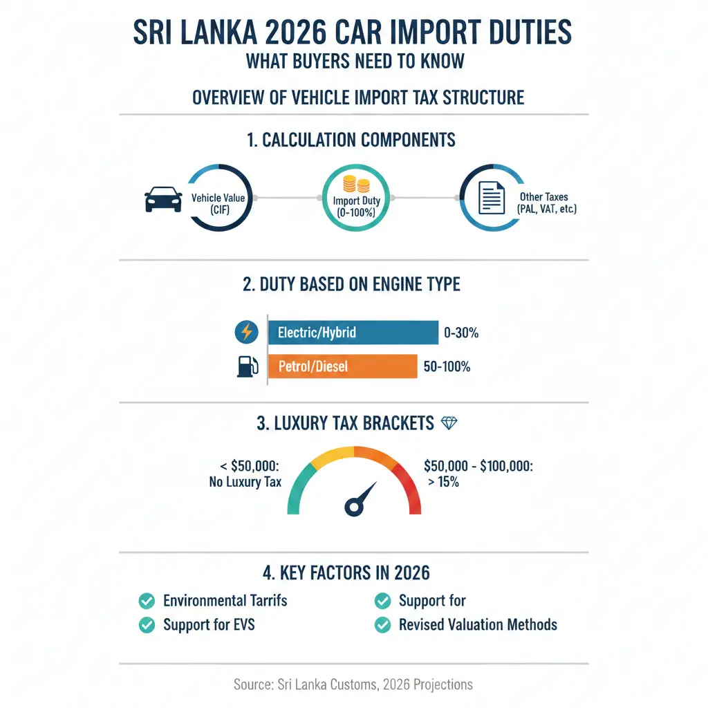Comprehensive guide to Sri Lanka's 2026 car import duties, including new tax rates, luxury thresholds, and Budget 2026 changes affecting buyers.