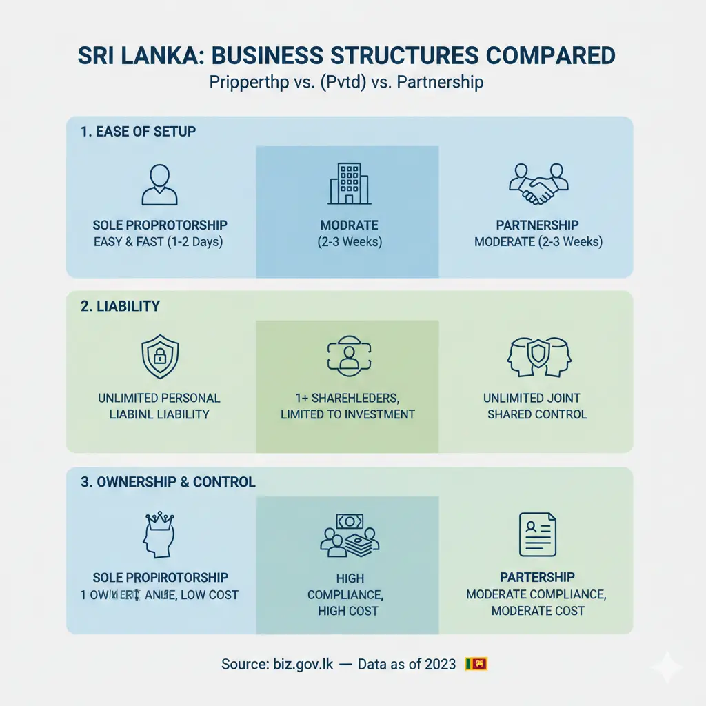 Overview: Choosing the right structure in Sri Lanka In Sri Lanka, most small businesses are set up as a sole proprietorship, partnership, or private limited company ((Pvt) Ltd). The best option for you depends mainly on your risk tolerance, growth plans, tax and compliance burden, and whet...