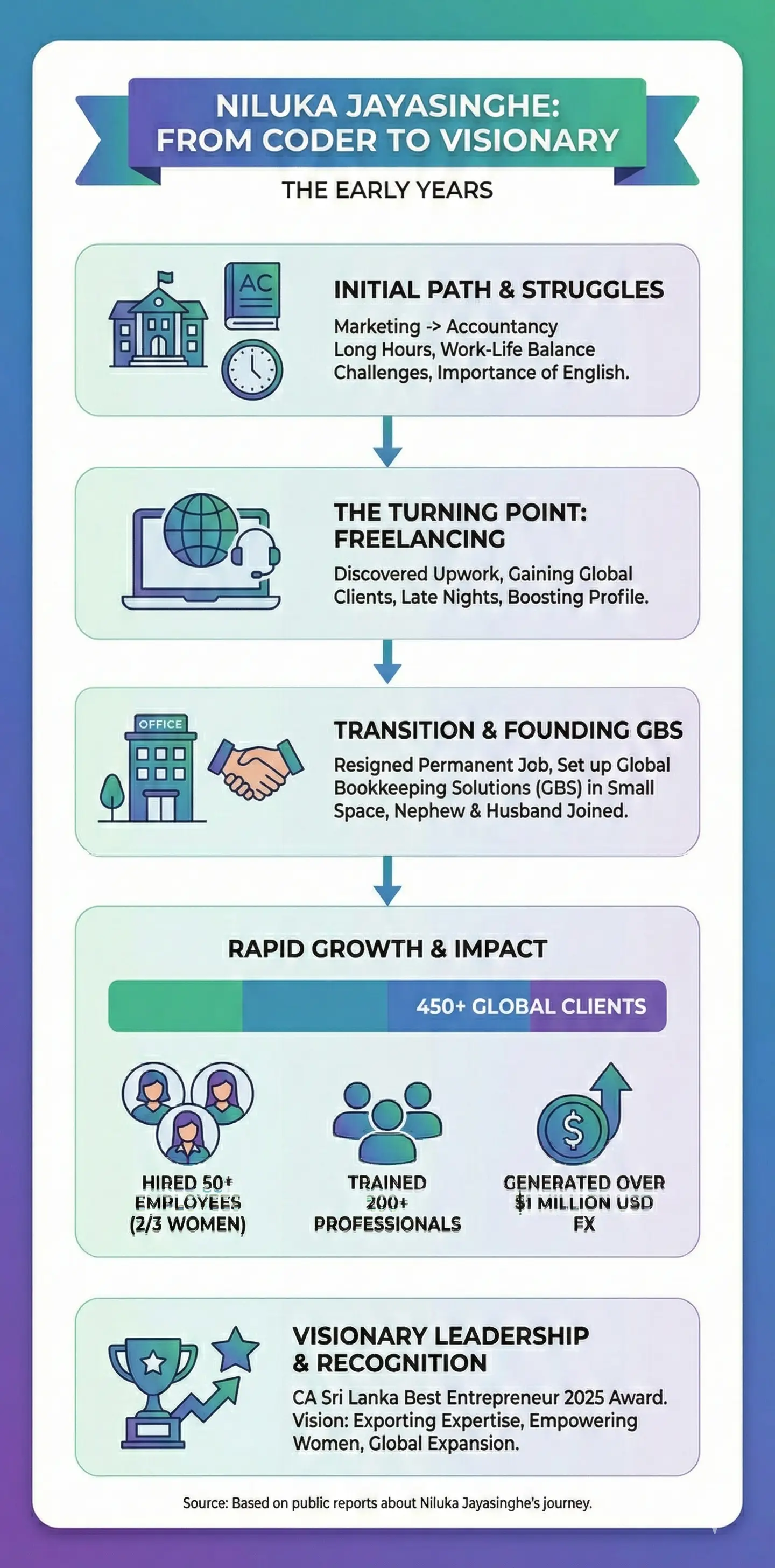 This was the moment Niluka shifted from being just a coder to becoming a visionary. She realized her most important project wasn't software, but a new business model. A model that would empower local talent, particularly women, and prove that you can build a world-class tech company in Sri Lanka. She started learning how Sri Lankans can get remote jobs with foreign companies, laying the foundation for what would become a million-dollar enterprise.