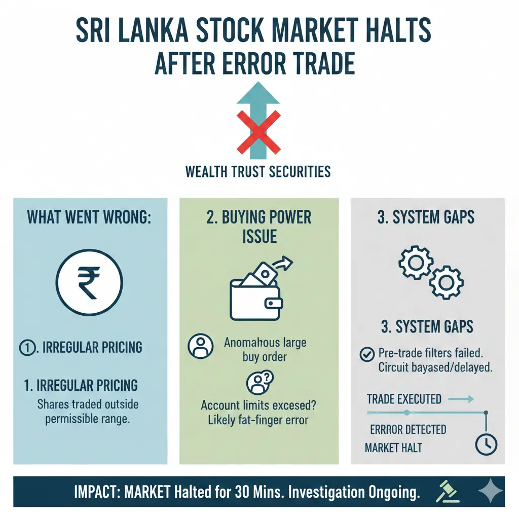 In the wake of the erroneous high‑value purchase order in newly listed Wealth Trust Securities, Sri Lanka’s capital market regulators moved rapidly to contain the fallout and safeguard market integrity. The Colombo Stock Exchange (CSE), acting in consultation with the Securities and Exchange Commission of Sri Lanka (SEC), first halted trading and then took the unprecedented step of cancelling all equity trades executed prior to the market halt on the day of the incident. The initial response came shortly after the opening auction, when an order to buy Wealth Trust Securities at an abnormally high price of 25,000 rupees per share was executed, despite the stock having been offered at 7 rupees in its initial public offering. That single order momentarily drove reported market turnover to around 162 billion rupees within minutes of the market opening, far out of line with typical daily activity. Given the scale of the mispricing and its potential to distort investor buying power across multiple counters, the CSE imposed a market halt as a first line of defence to restore order and assess systemic risk. As details of the trade’s knock‑on effects became clearer, regulators concluded that the abnormal transactions had not only distorted the price of the new listing but had also affected the capacity of investors who sold at inflated prices to deploy that artificial buying power into other listed securities. This raised the risk of wider contagion, misallocation of capital, and subsequent failures in settlement. To prevent such systemic disruption, the CSE, with the concurrence of the SEC, decided to cancel all equity orders and trades executed before the halt on that day, effectively resetting the market to its pre‑opening position. In a later communication, the CSE announced that, based on requests from market participants and in the interest of maintaining a “fair and orderly market,” the exchange would keep the market closed for the remainder of the day. All transactions conducted prior to the halt were nullified, and orders placed after 9:00 a.m. were purged from the system. Trading was scheduled to resume the next trading day under normal conditions, with participants required to re‑enter their orders into their order management systems. At the same time, regulators acknowledged that the episode had exposed a gap in the safeguards that normally prevent extreme pricing errors. While the CSE’s trading system is designed to restrict very large deviations in order prices for previously traded shares, the same price‑band protections did not apply to newly listed IPO securities. This allowed the anomalous Wealth Trust order to pass through standard system controls. The CSE and SEC therefore signalled a regulatory shift, introducing a key preventive measure: market orders will no longer be permitted on the first day of trading for newly listed securities. By forcing investors to specify limit prices on day one, regulators aim to eliminate the risk of unchecked market orders being matched at irrational or erroneous prices in thin or uncertain opening order books. The incident also prompted calls from the issuer, Wealth Trust Securities, for a thorough regulatory investigation to determine how such a large, mispriced order cleared trading system checks and to ensure accountability. The company stated that the trades in question were initiated by third parties, emphasized that no pre‑IPO shareholders had sold shares in the market, and insisted that the firm’s fundamentals and operations remained unaffected. The public appeal underscored the need for the SEC and CSE to tighten oversight, clarify responsibilities among brokers, investors, and system operators, and put in place enforcement mechanisms to deter similar disruptions. Taken together, the regulators’ actions—immediate market halt, sweeping cancellation of trades, and the introduction of new first‑day trading rules—represent one of the most far‑reaching interventions in the history of the Colombo Stock Exchange. The episode highlighted both the vulnerabilities created by high‑velocity electronic trading in newly listed securities and the readiness of Sri Lanka’s market authorities to override executed trades when they judge that systemic risk, investor protection, and market integrity are at stake.