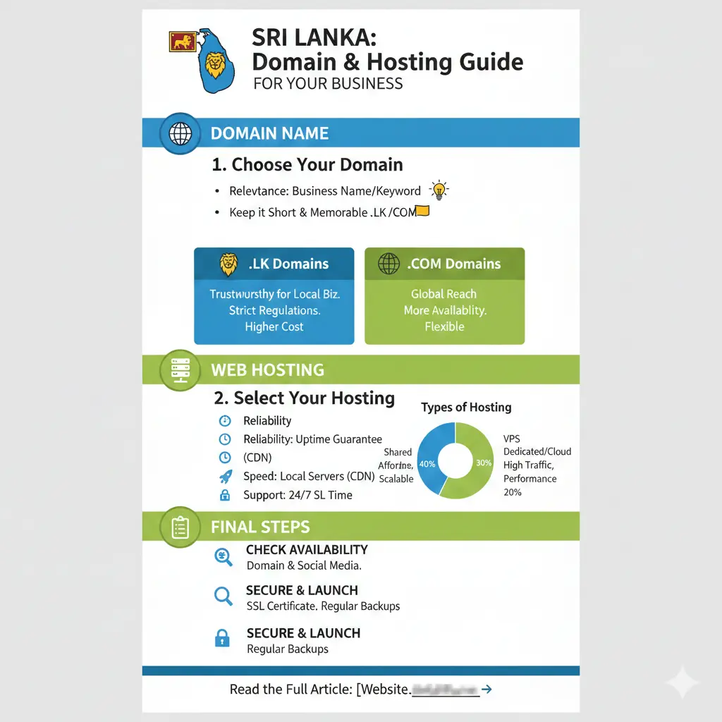 How to Choose a Domain Name and Hosting for Your Sri Lankan Business Your domain name and hosting are the foundation of your online presence; changing them later can be painful and expensive. Choosing wisely at the start helps your Sri Lankan business look professional, load quickly and stay sec...