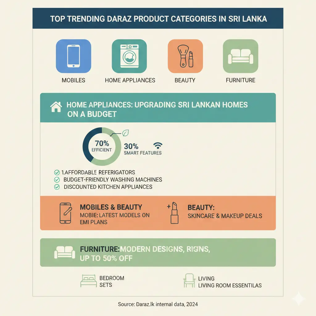 Top trending Daraz product categories in Sri Lanka (mobiles, home appliances, beauty, furniture)