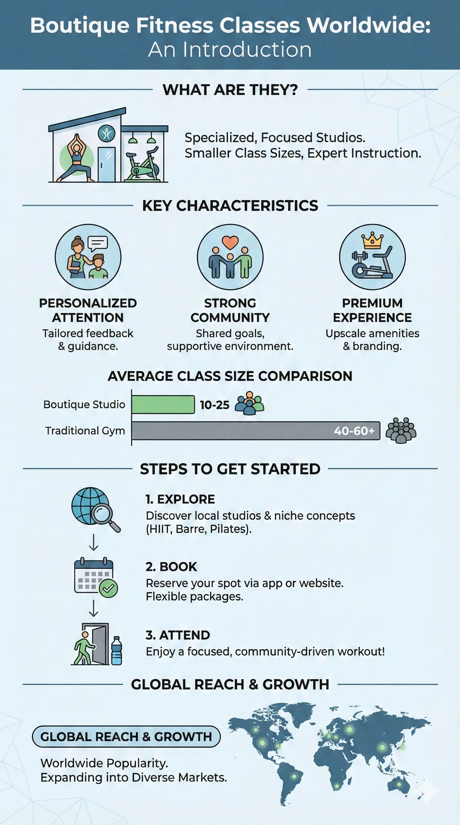 Boutique fitness refers to unique, specialized workout experiences often offered in small, upscale studios