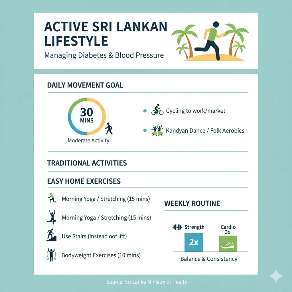 Alongside a healthy diet, regular physical activity is a powerful tool for managing blood sugar and lowering blood pressure. You don’t need an expensive gym membership to stay active; movement can be easily woven into the fabric of your daily Sri Lankan life. The goal is to make your body work, raise your heart rate, and do it consistently.