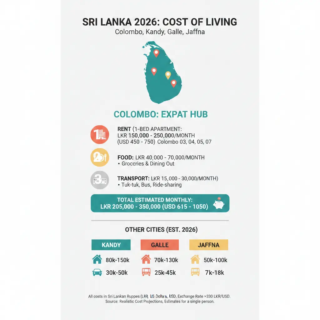 Realistic cost of living in Colombo, Kandy, Galle, and Jaffna in 2026 (rent, food, transport)