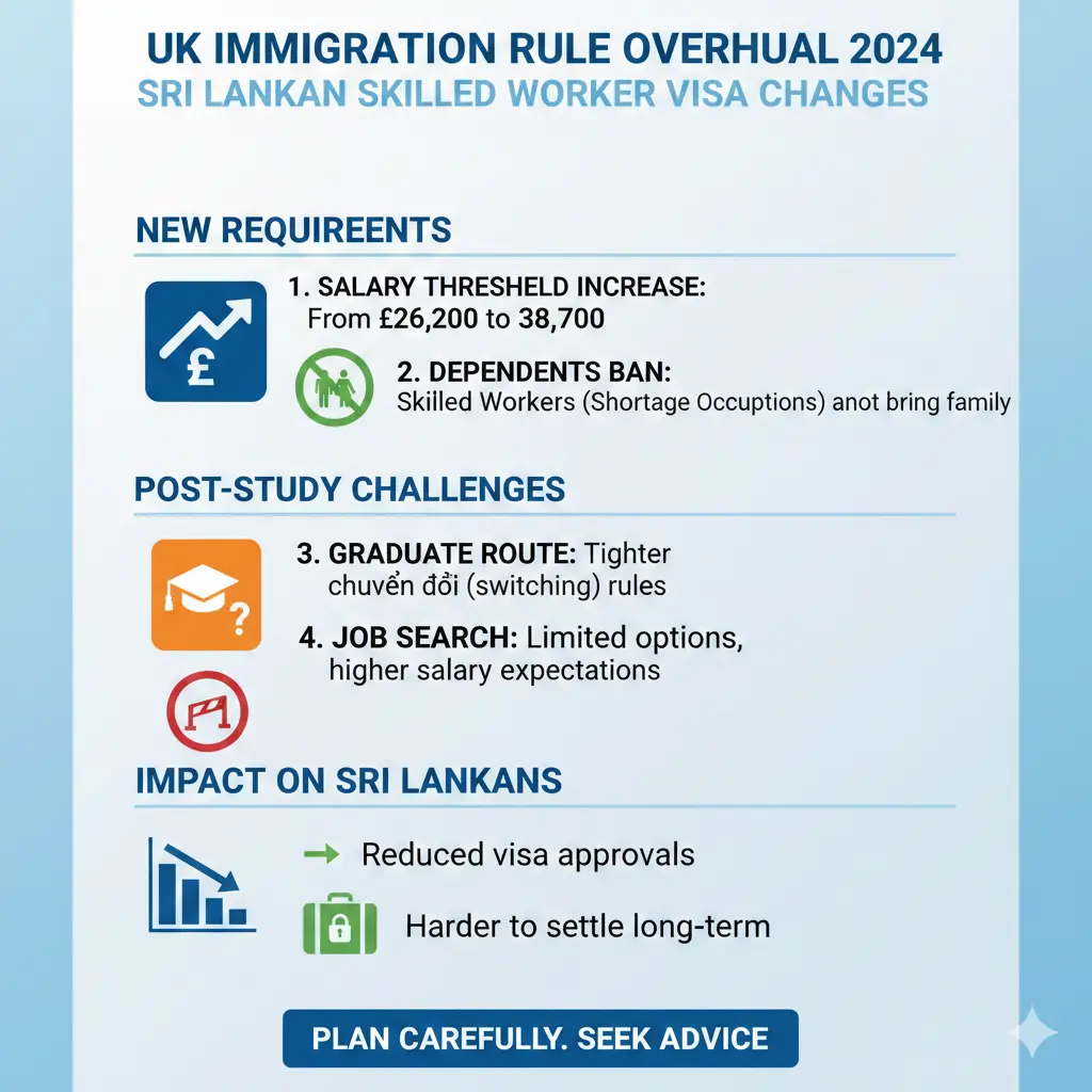 Understanding the UK's 2024 Immigration Rule Overhaul In 2024, the UK government implemented a series of significant changes to its immigration system, creating a more challenging landscape for Sri Lankan professionals, students, and care workers aiming to move to the UK. These reforms are designed...