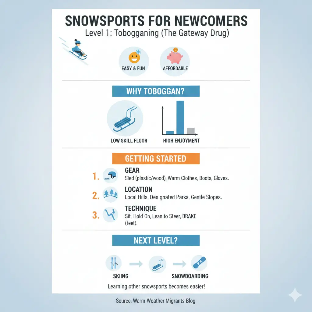 If you have never played in snow, start here. Tobogganing involves sitting on a piece of plastic and letting gravity throw you down a hill. It requires zero skill, costs almost nothing, and is exhilarating.