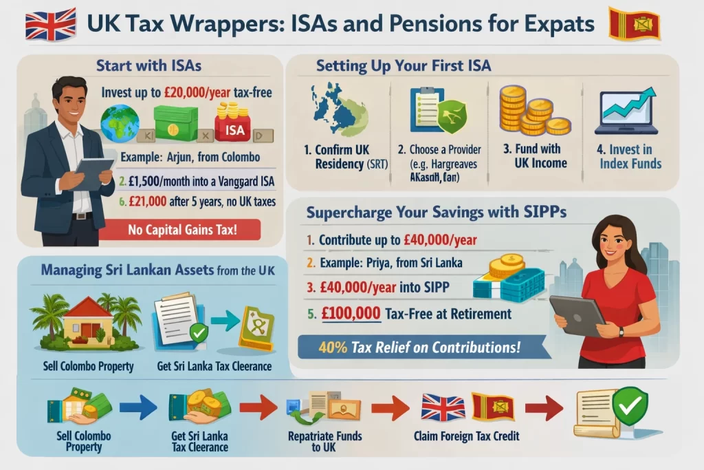 But wait — there’s more to consider. You live in the UK as a Sri Lankan expat, juggling assets back home. UK tax wrappers like ISAs and SIPPs let you shield new investments from UK taxes, even with Sri Lankan holdings. These tools work for UK tax residents under the Statutory Residence Test (SRT), regardless of your passport.[5]