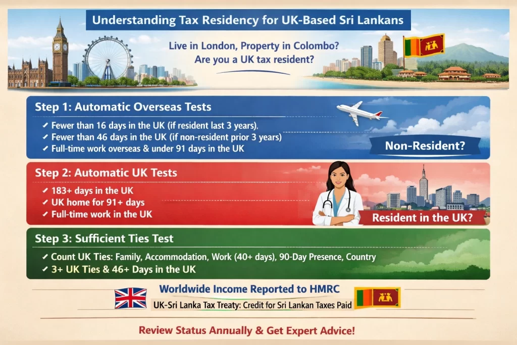 Still unclear? Count UK ties—family, accommodation, work (40+ days), 90-day prior presence, country—and match against days spent. With 3+ ties and prior residency, just 46 UK days makes you resident.[1][2] Sri Lankan assets like Colombo rentals factor in indirectly: as a UK resident, you report worldwide income via Self Assessment, but the UK-Sri Lanka tax treaty credits Sri Lankan taxes paid to avoid double taxation.[5]