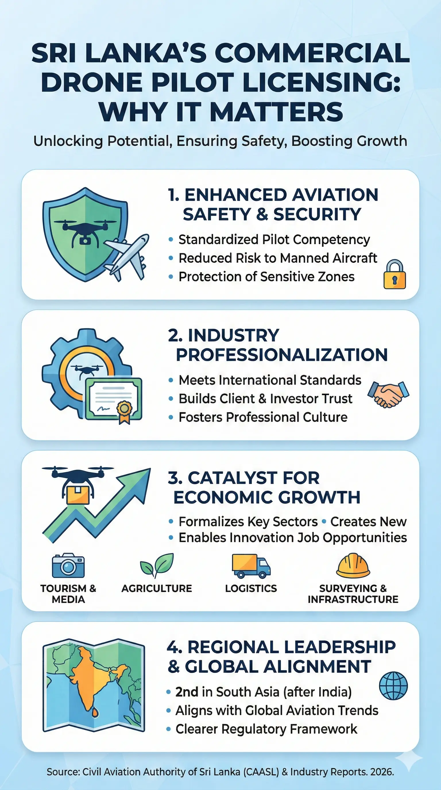 Current regulations strictly mandate that all UAS used for commercial purposes must be registered with the CAASL. The new licensing drive aims to foster a professional operational culture within the local drone industry, aligning Sri Lanka with global aviation trends where UAS technology is increasingly vital.
