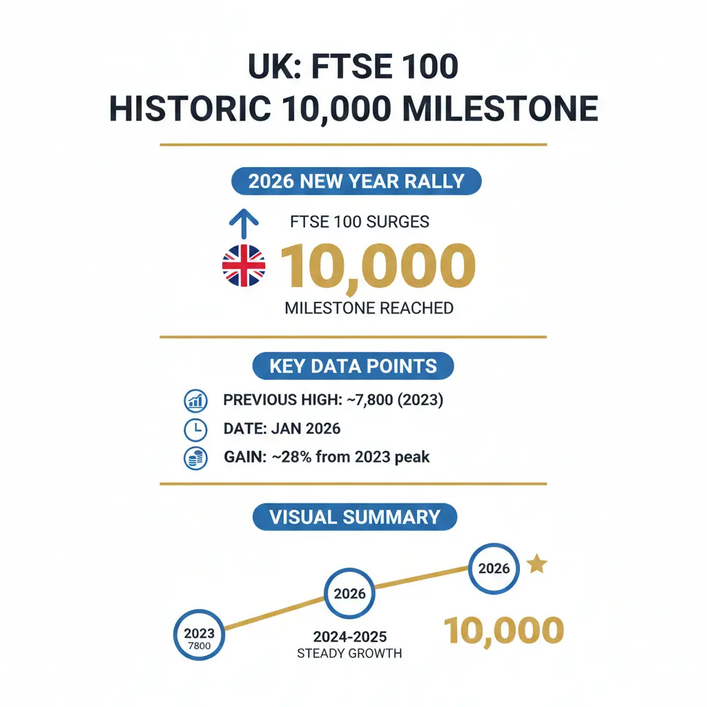 FTSE 100 Surges to 10,000 Milestone in 2026 New Year Rally The FTSE 100 index achieved a historic milestone by closing above 10,000 in early January 2026, marking its strongest opening in years amid policy optimism and economic stability measures. Prime Minister Keir Starmer's announcement of ra...