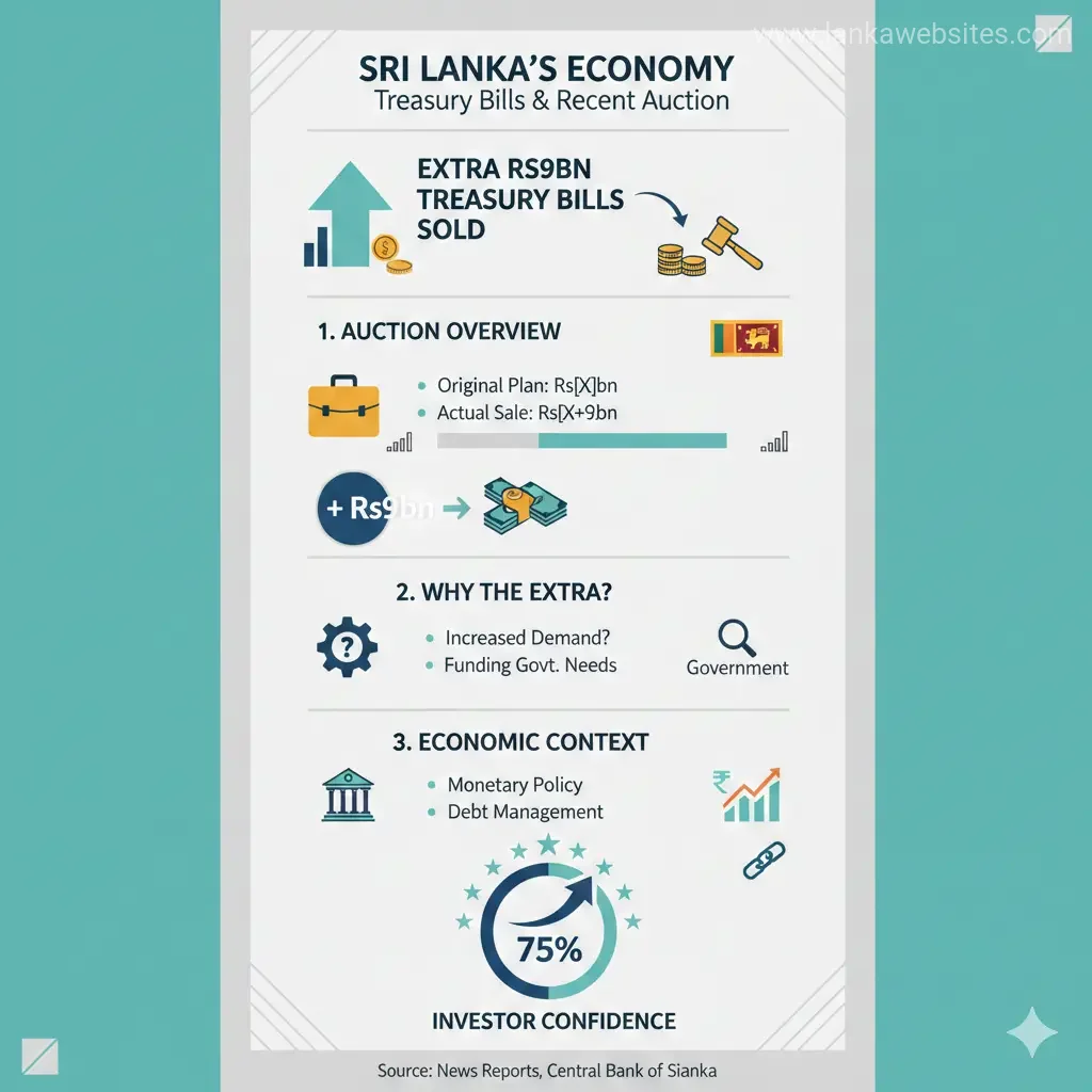 The sale of extra Rs9bn Treasury bills after an auction is a significant development that can provide insights into Sri Lanka's economic situation and its efforts to manage its finances. The sale of these T-bills can help the government to raise funds to finance its activities, such as paying salaries, funding infrastructure projects, and servicing debt.