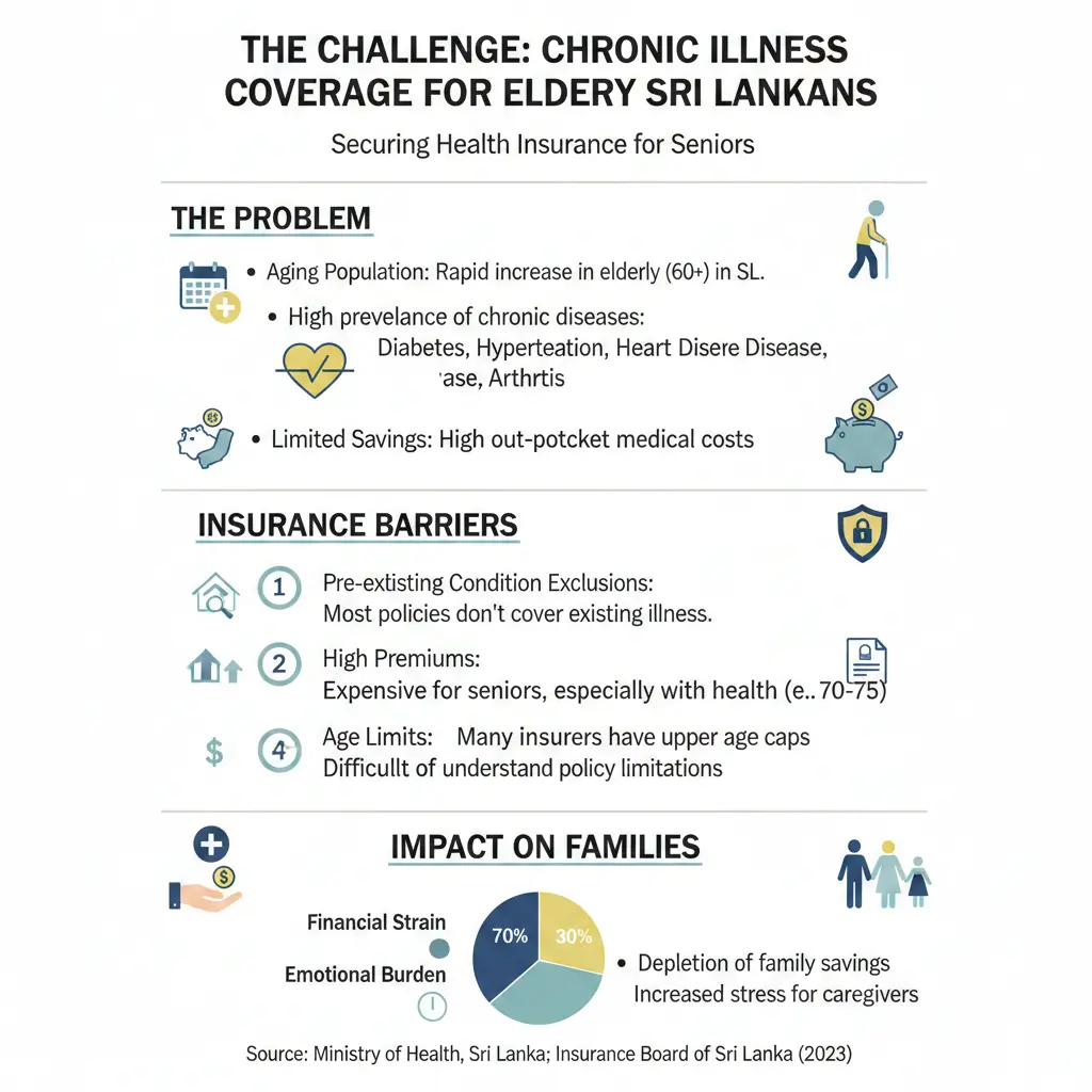 Finding the right health insurance for elderly parents is a priority for many families. However, this task becomes much more difficult when parents live with chronic illnesses. Long-term conditions such as diabetes, high blood pressure, heart disease, and arthritis are common among seniors. In Sri Lanka, securing a good insurance plan that covers these pre-existing conditions is a significant challenge.