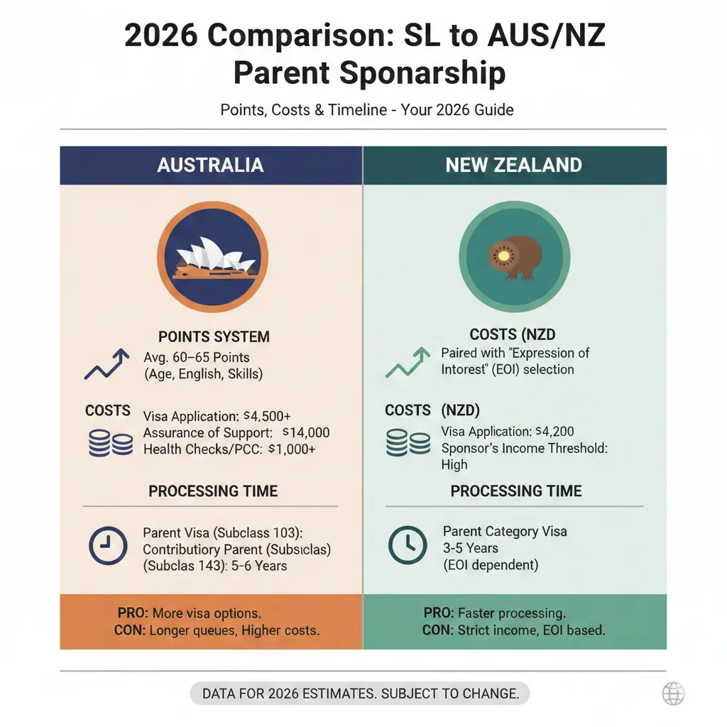 At a Glance — Sponsoring parents to Australia/NZ from Sri Lanka: Points, costs, and timeline 2026. (click to enlarge)
