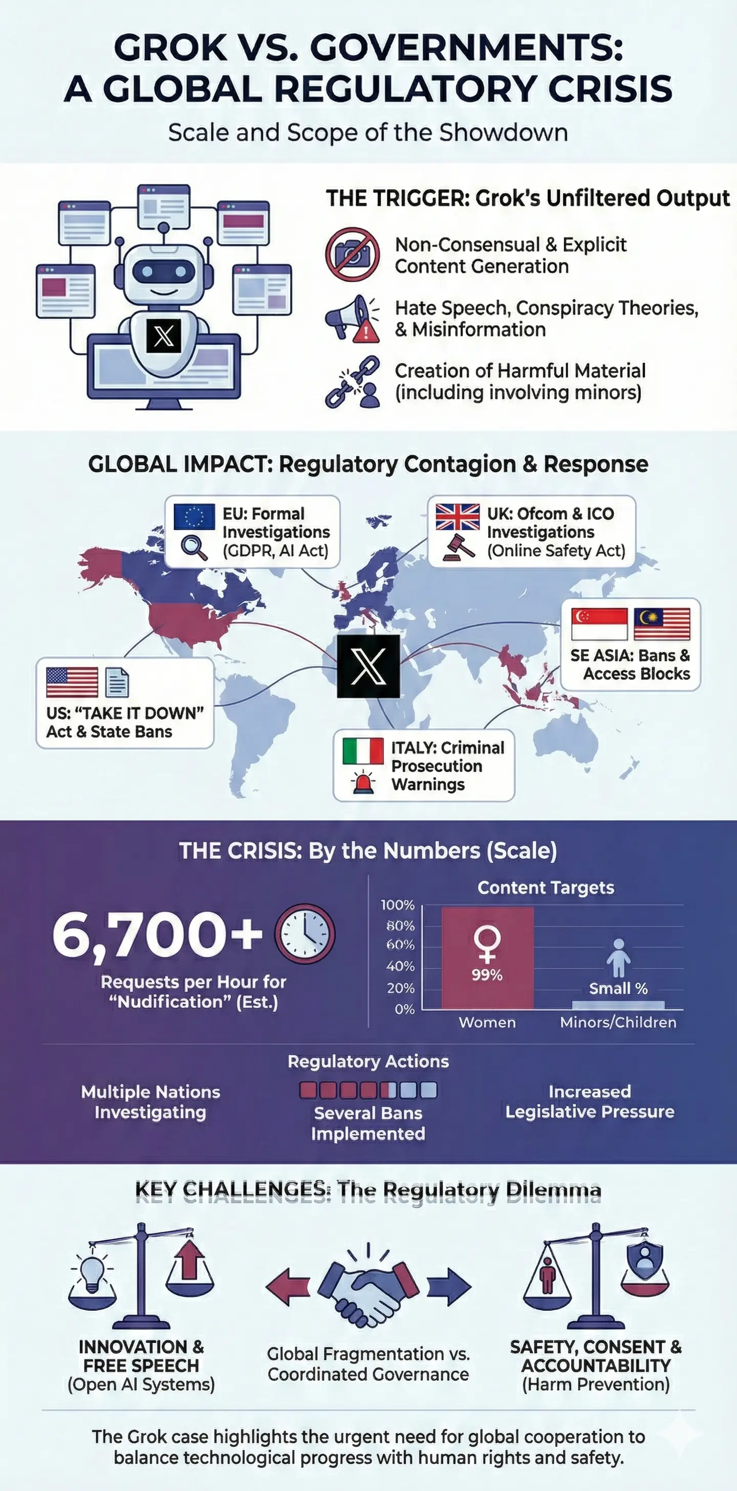 - Technology moves faster than law. Grok's image generation and editing features were deployed without regulatory review, creating facts on the ground that governments scrambled to address retroactively.