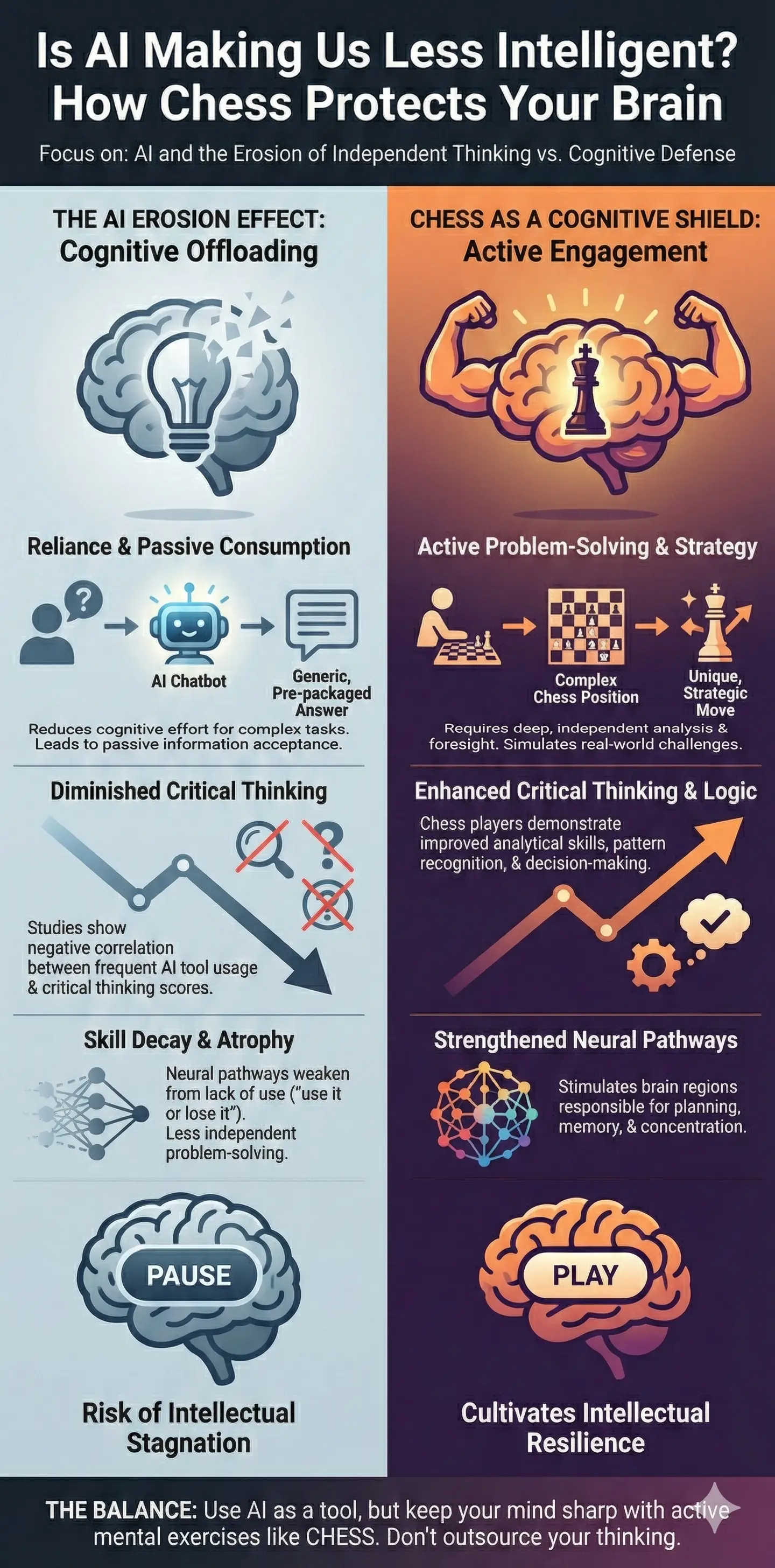 AI isn't killing IQ, but it's changing how we think through cognitive offloading—outsourcing memory, reasoning, and even social skills to machines. This can weaken critical thinking, attention, and empathy over time. Chess (and similar effortful activities) actively trains these skills and may protect long-term brain health.