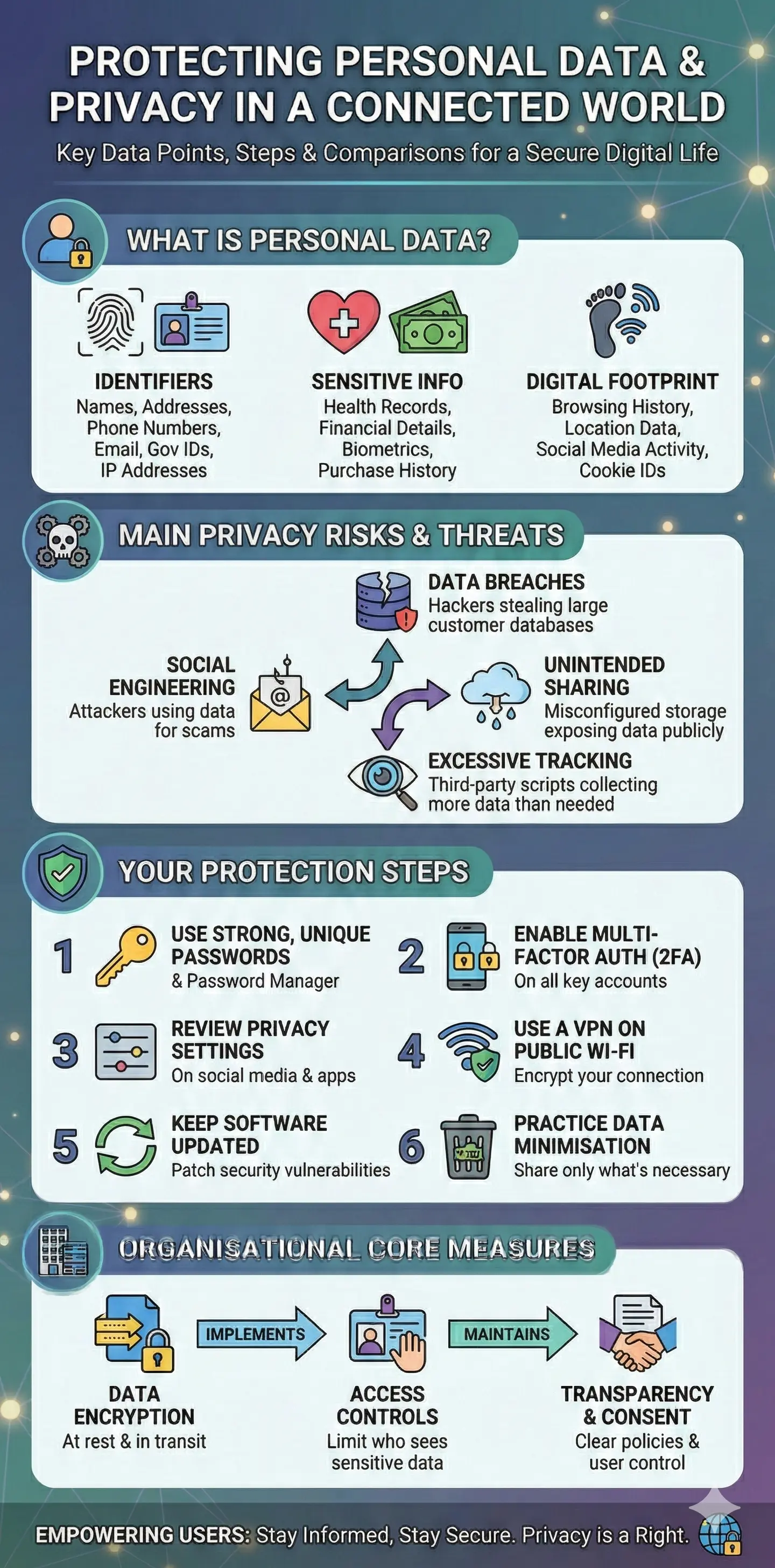 Protecting Personal Data and Privacy in a Connected World Every online action—browsing, messaging, shopping—generates data that can be collected, analysed and sometimes misused. High‑profile breaches and invasive tracking have made privacy a central concern for individuals, regulators and busine...
