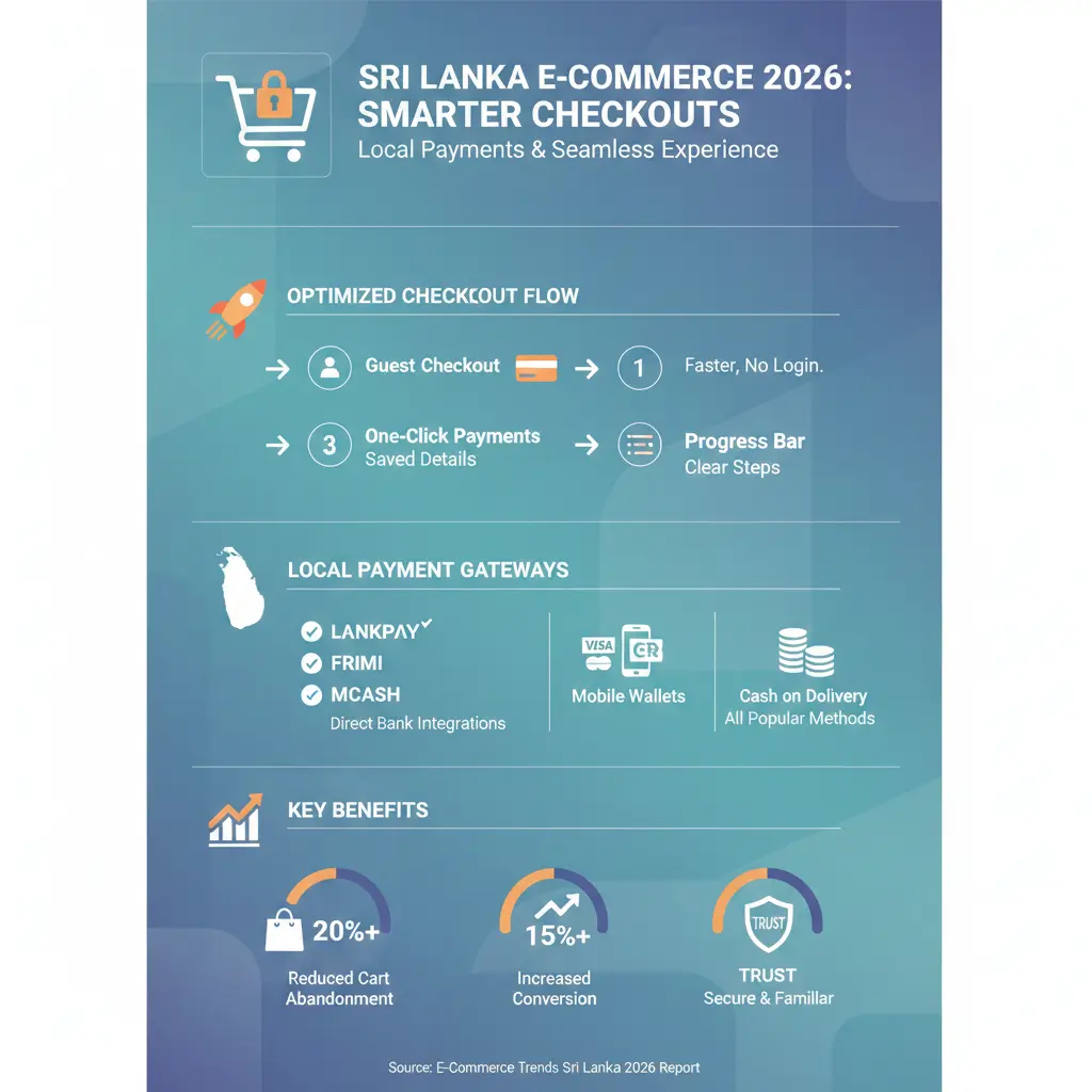 70% of Sri Lankan carts abandon at checkout due to unfamiliar global gateways or complex forms. Local-first checkout flows convert 3–5x better.