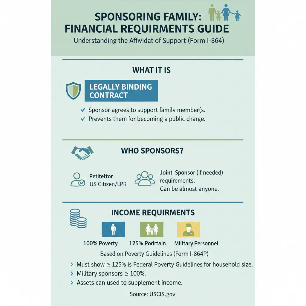 U.S. immigration law requires sponsors to prove they can support the intending immigrant at an income level of at least 125% of the Federal Poverty Guidelines. This is the government’s method for ensuring the sponsored immigrant will not become a “public charge.” There is a notable exception: if you are a member of the U.S. Armed Forces on active duty and you are sponsoring your spouse or child, the requirement is lowered to 100% of the poverty guideline, as established under 8 CFR § 213a.2.