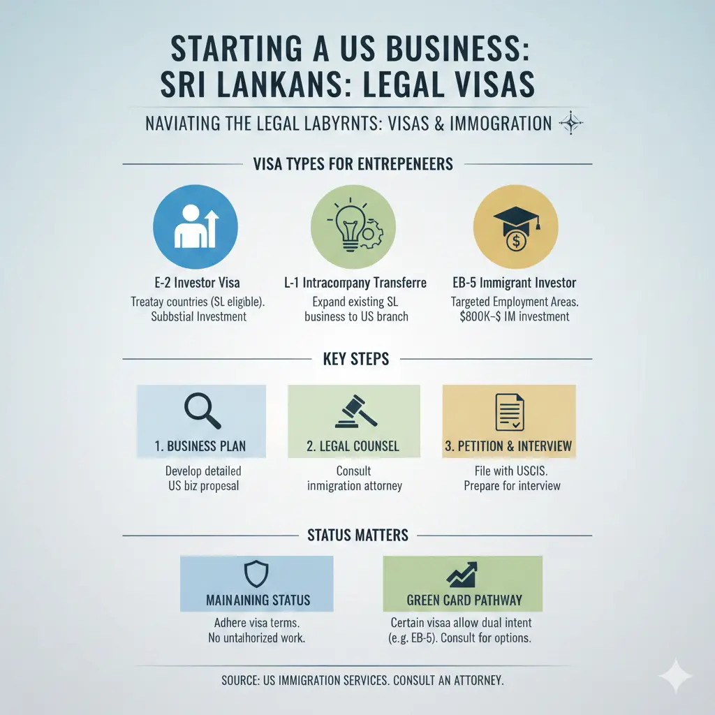 Before you register a company name or lease an office, your absolute first step is securing the proper immigration status. For most entrepreneurs, there are a few primary avenues, including the high-investment EB-5 Immigrant Investor program or the L-1 visa for transferring executives from an existing overseas company. However, for many Sri Lankans, the most practical and direct route is the E-2 Treaty Investor visa.