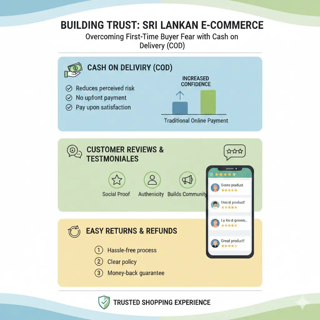 How to build trust for a new Sri Lankan online store: Cash on delivery, reviews, and returns.
