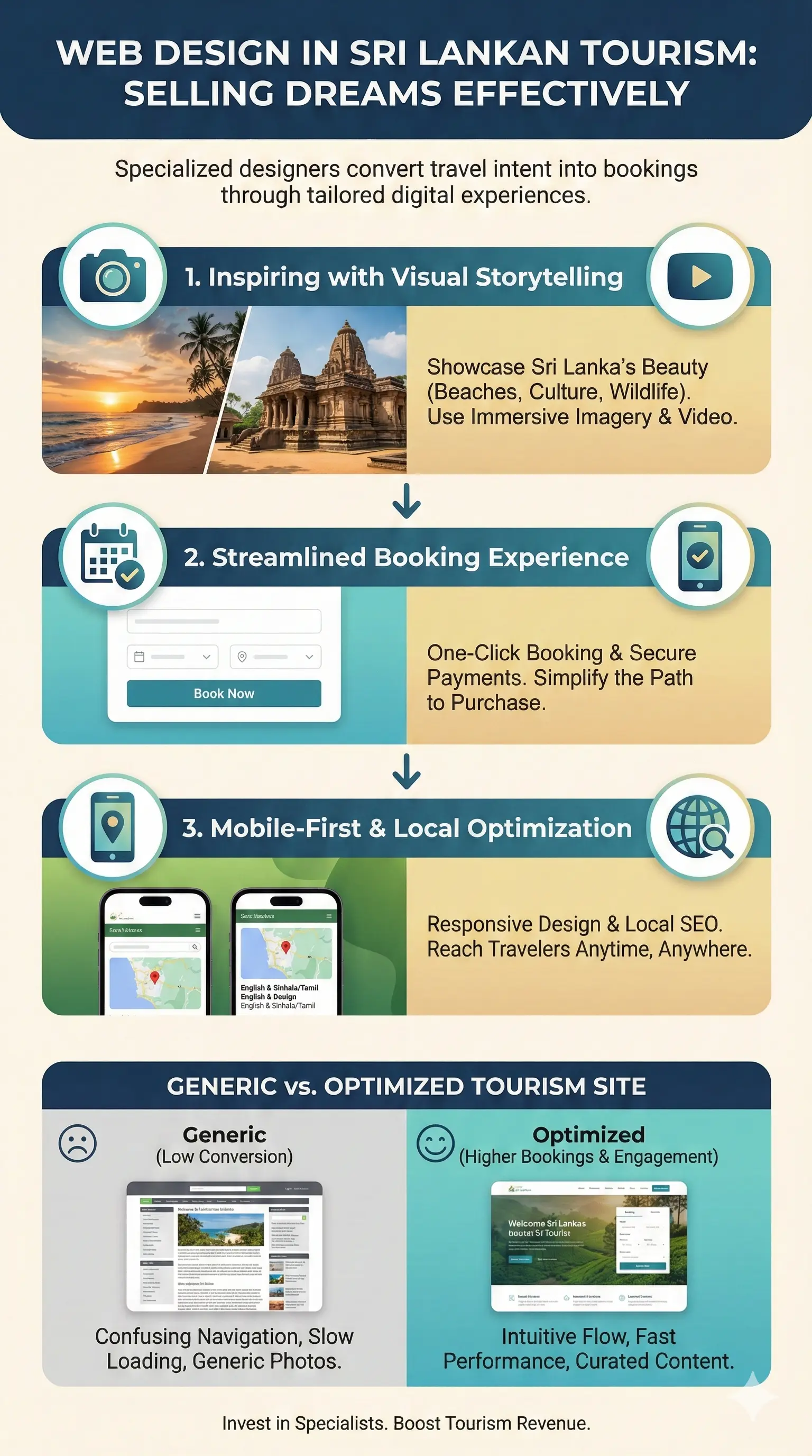 Sri Lanka's tourism industry ranges from luxury resorts to adventure tour operators, from boutique guesthouses to wildlife safari companies. Despite this diversity, tourism websites share common challenges that require specific design understanding.