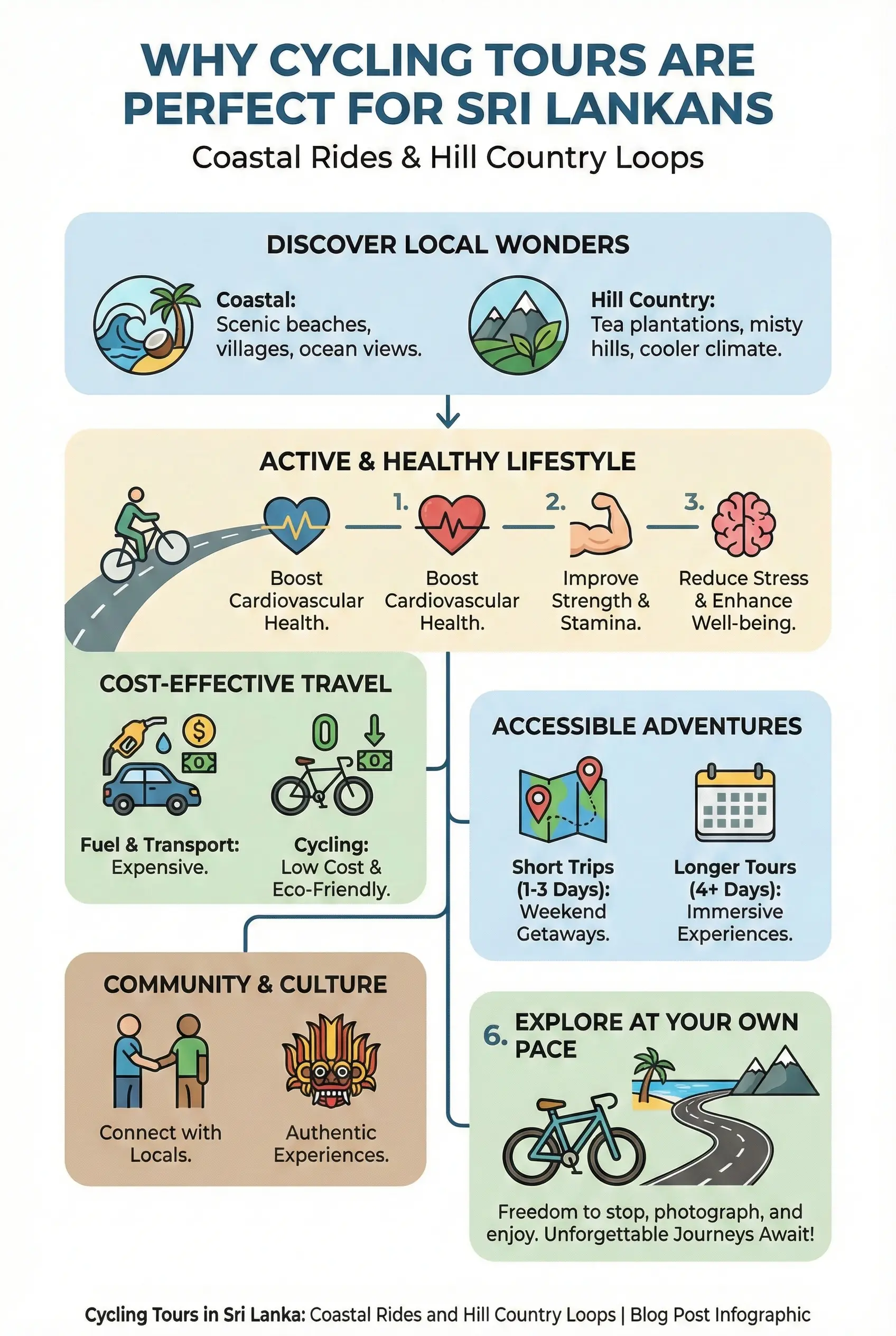 Imagine gliding along sun-kissed coastal paths from Negombo to Galle, the salty breeze in your face, or powering up misty hill country loops around Nuwara Eliya, surrounded by tea plantations that stretch to the horizon. That's the thrill of cycling tours in Sri Lanka—coastal rides and hill country loops that let us locals rediscover our island's stunning diversity, all while staying fit and connected to nature.