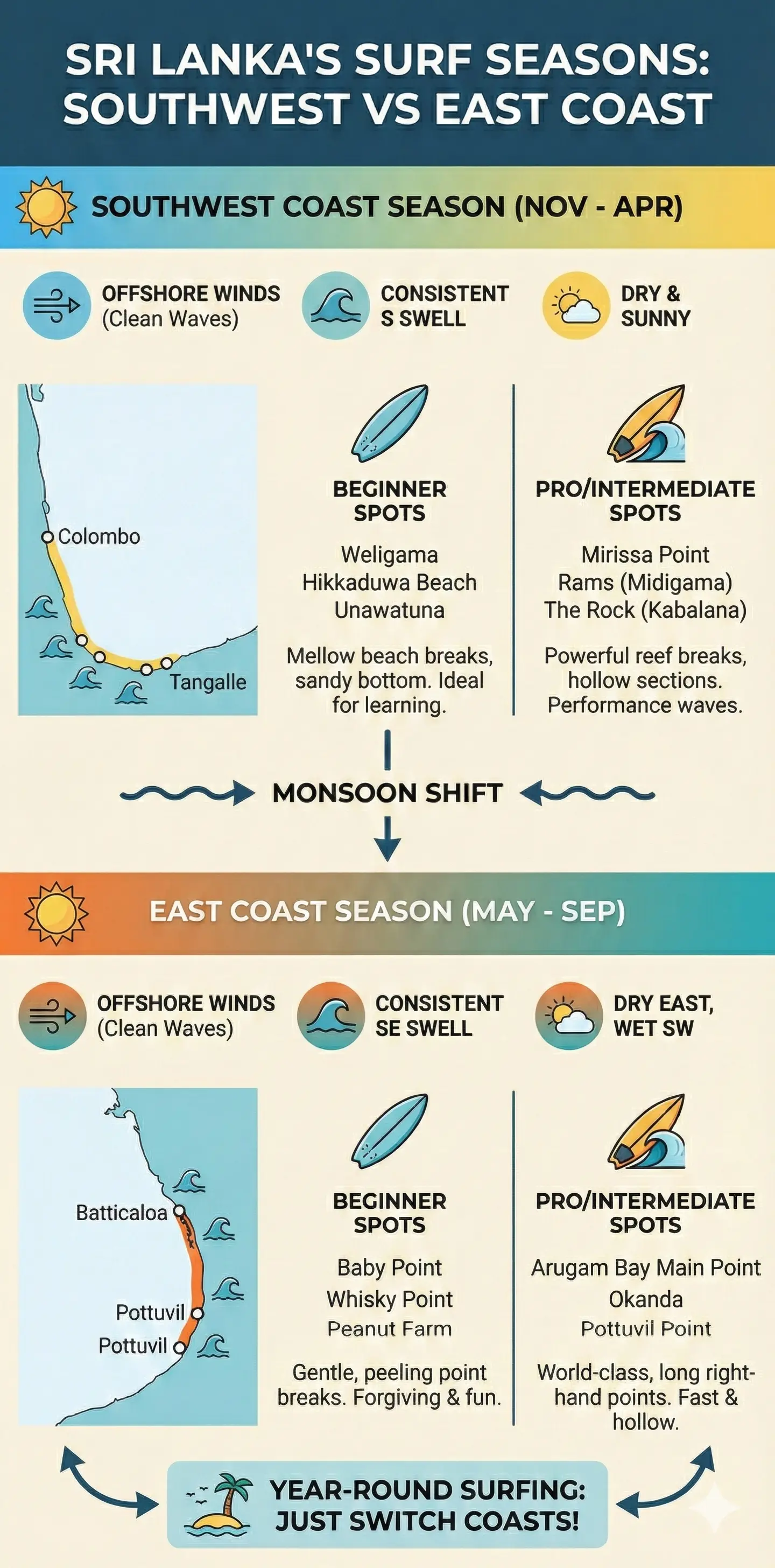At a Glance — Surfing in Sri Lanka: Best Spots by Season for Beginners and Pros (click to enlarge)