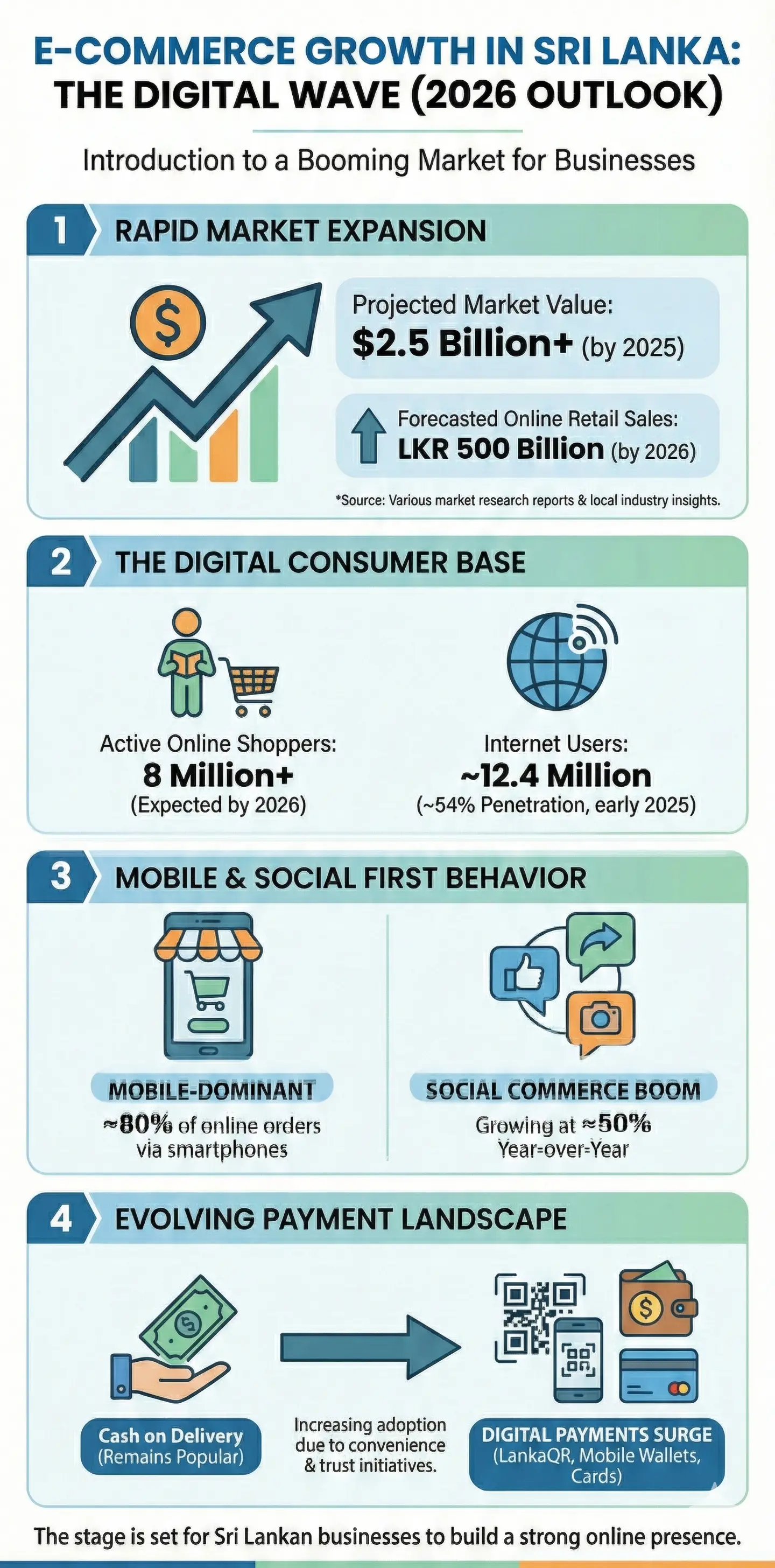 Introduction to E-Commerce Growth in Sri Lanka Sri Lanka's e-commerce landscape is booming, with the market projected to grow over 25% annually through 2026, fueled by rising mobile wallet usage like FriMi and PayHere, social commerce on platforms popular in Colombo and Kandy, and a burgeoning middl...