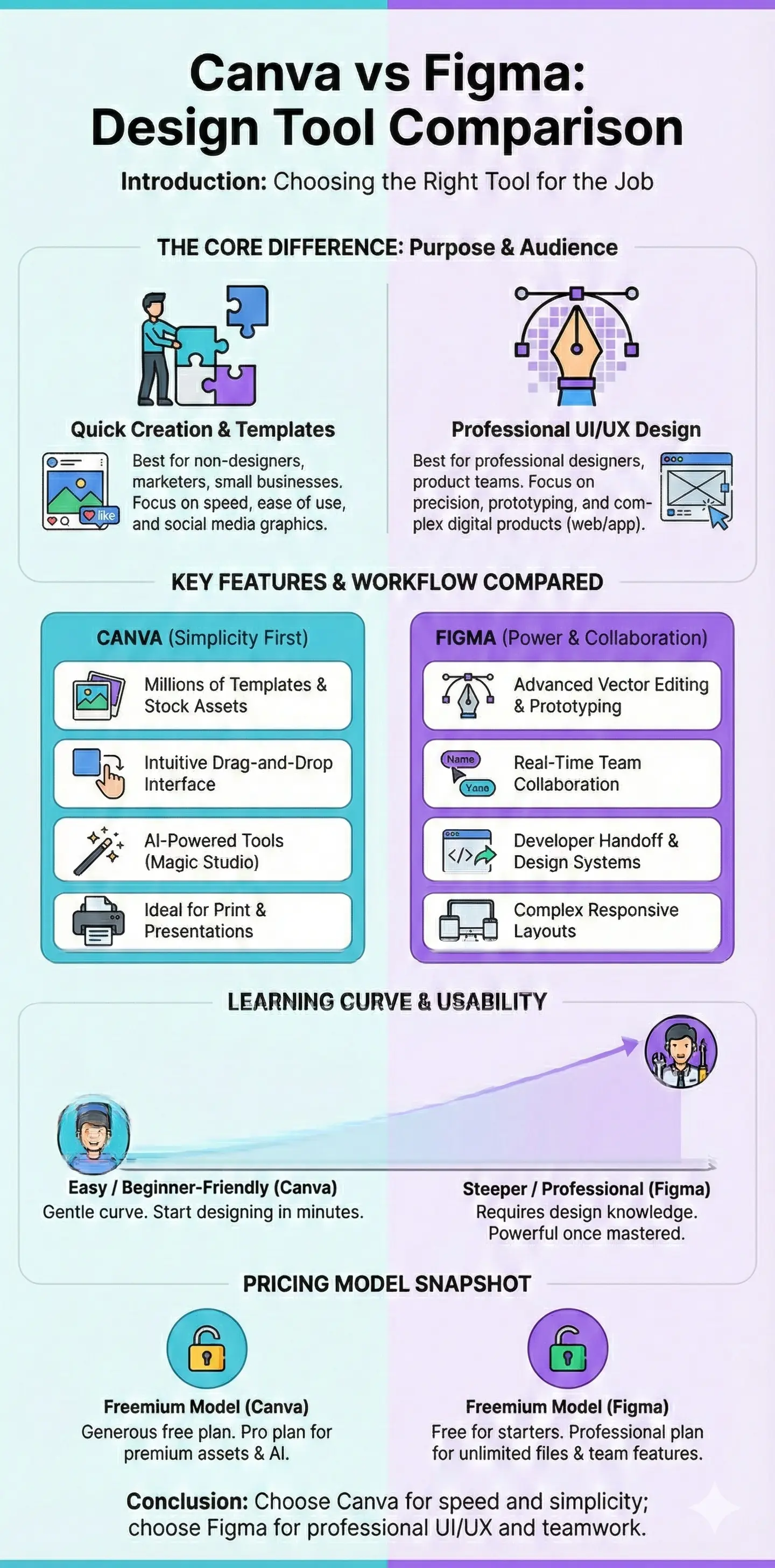 When choosing between Canva and Figma, consider your design needs, target audience, and budget. If you're looking for a user-friendly design tool with a vast template library, Canva might be the better choice. If you're looking for a more advanced design tool with robust collaboration features, Figma might be the better choice.