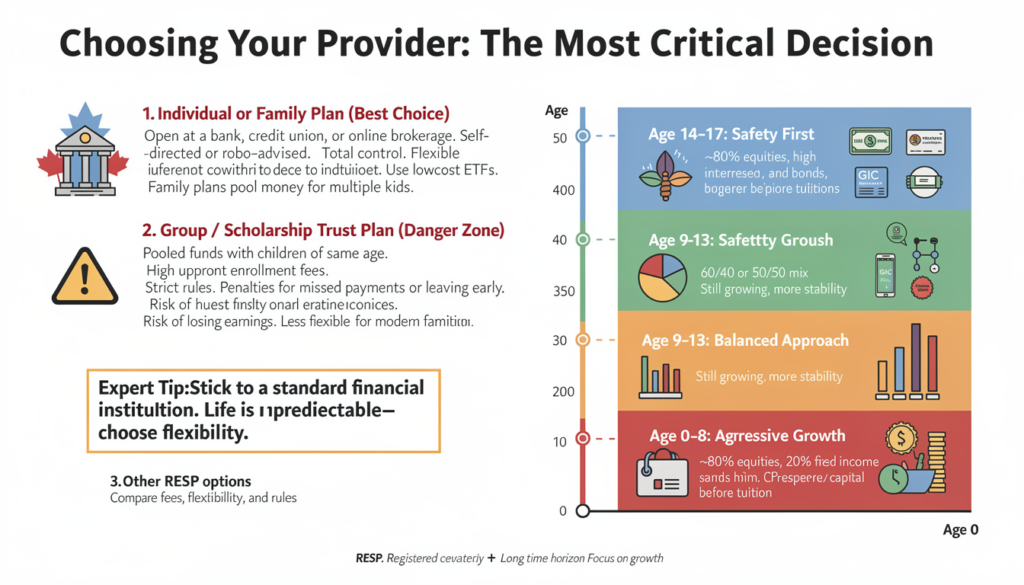 This is where I see parents make their most expensive mistakes. Not all RESPs are created equal. In Canada, you generally have three categories of providers, and one of them should be approached with extreme caution.