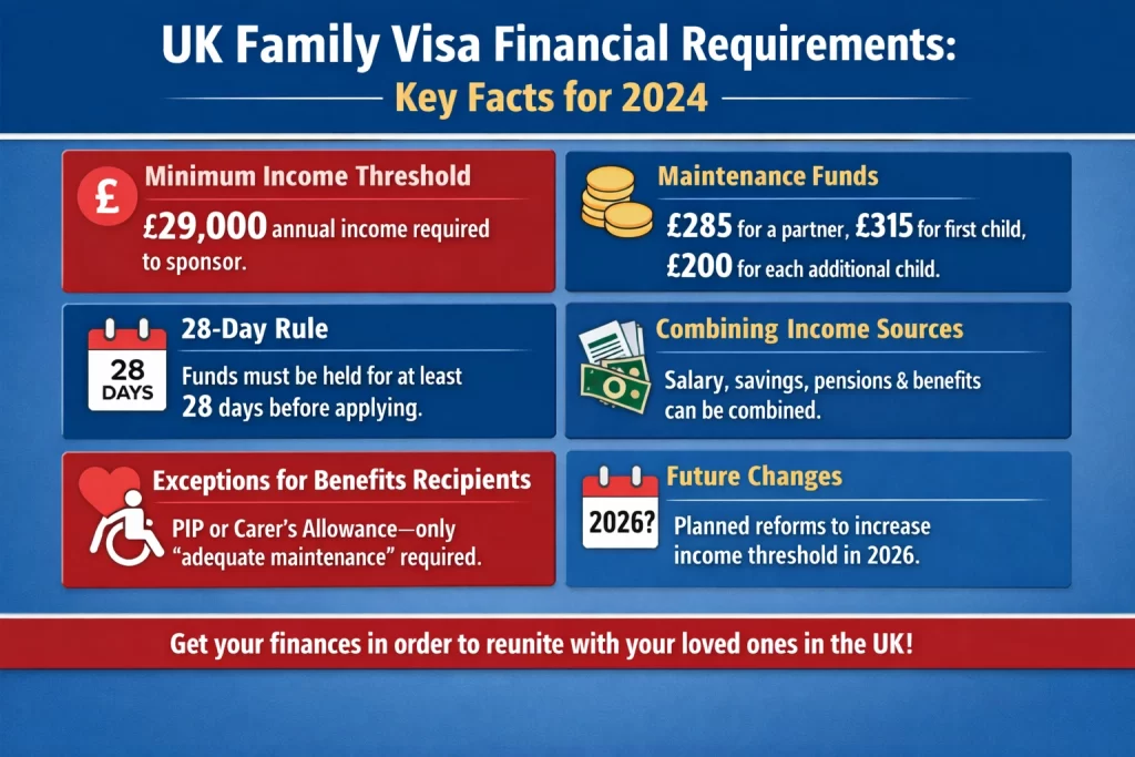 Sponsor needs £29,000 income; maintenance funds £285 partner, £315 first child, £200 additional[1][2][3]