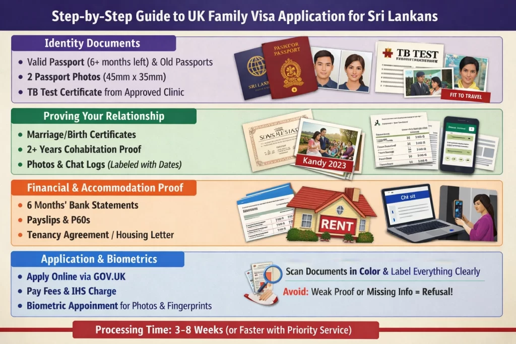 Apply via GOV.UK up to three months before travel. Fill the form with personal history, finances, and relationship details. Pay fees, book biometrics at a Colombo Visa Application Centre for fingerprints and photo. Upload docs there or online—don’t miss the “specified evidence” rule, or expect a refusal.[3][4]