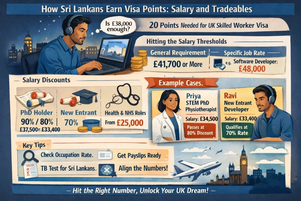 Picture this: Ravi, a sharp software developer from Colombo, stares at his laptop screen late into the night. He’s landed a job offer from a London tech firm, but the email mentions “tradeable points” and salary thresholds that make his head spin. He wonders if his £38,000 offer will cut it. Stories like Ravi’s fill my inbox weekly—Sri Lankans chasing UK dreams through the Skilled Worker route, where 20 of your 70 mandatory points hinge on salary smarts.