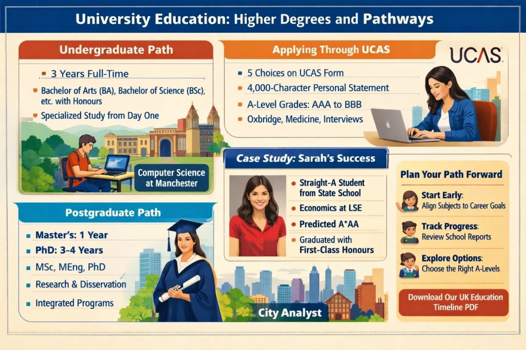 Take Sarah, a straight-A student from a state school. She targeted economics at LSE via UCAS, highlighting her stock market simulations in her statement. Despite competition, her predicted A*AA secured an offer. She started in September, balancing lectures and seminars, graduating with a first-class honours after three years—straight to a City analyst role.[3]