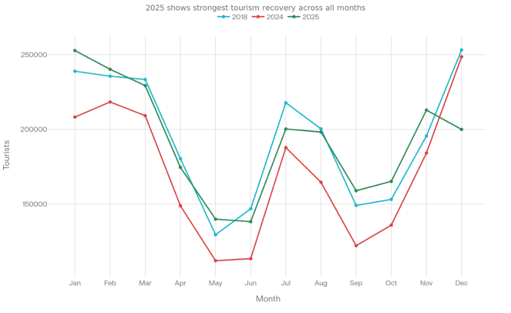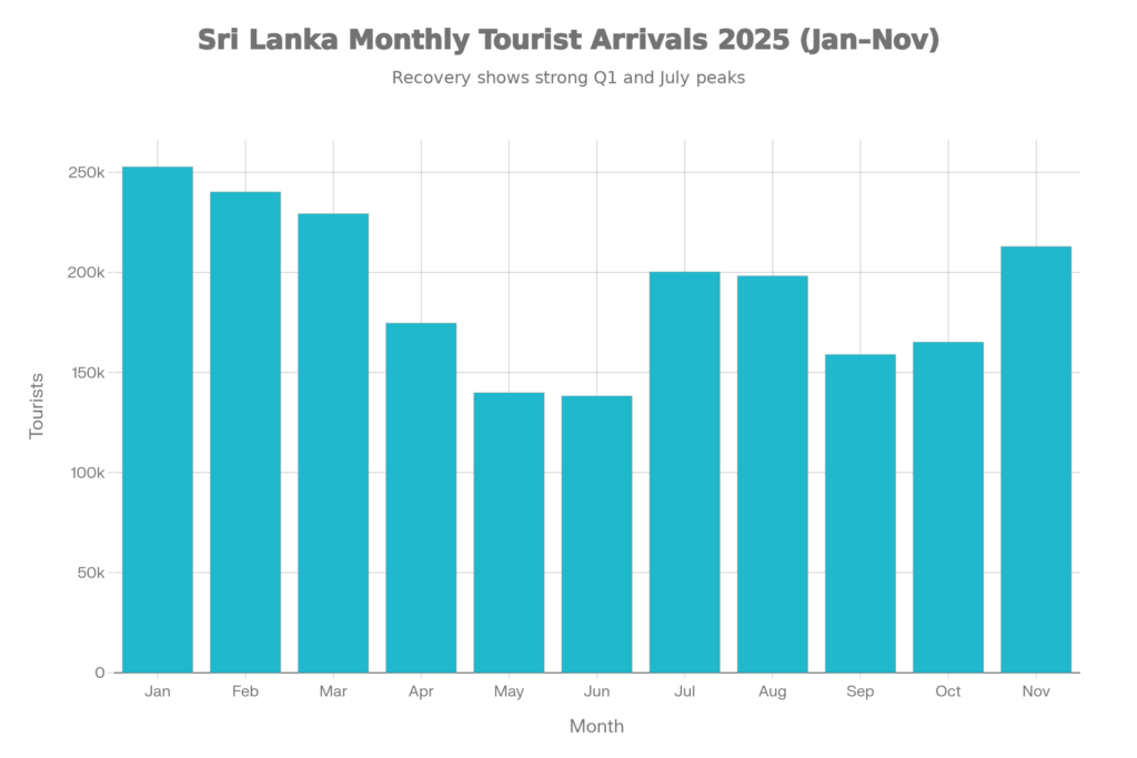- The comparison of 2018, 2024 and 2025 monthly arrivals shows that 2025 has already matched or exceeded the 2018 benchmark in many months, confirming that Sri Lanka’s visitor volumes are effectively back to pre‑crisis levels despite the cyclone shock.