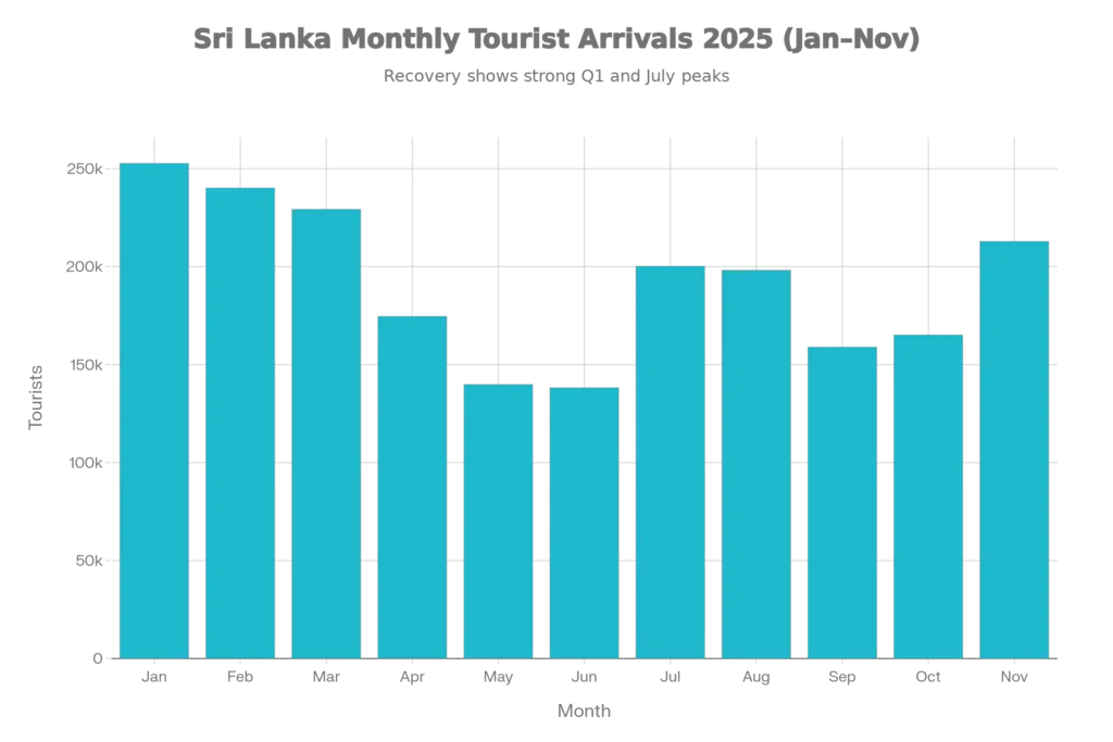- The comparison of 2018, 2024 and 2025 monthly arrivals shows that 2025 has already matched or exceeded the 2018 benchmark in many months, confirming that Sri Lanka’s visitor volumes are effectively back to pre‑crisis levels despite the cyclone shock.