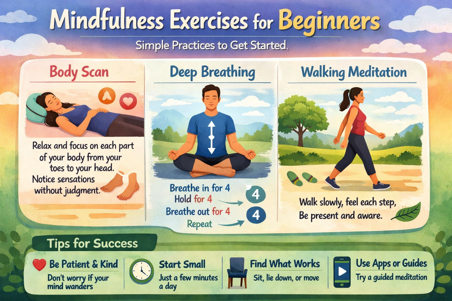 Another great exercise for beginners is deep breathing. This involves focusing your attention on your breath, feeling the sensation of the air moving in and out of your body, and letting go of any thoughts or distractions. You can try inhaling for a count of four, holding your breath for a count of four, and exhaling for a count of four, repeating the cycle several times. This can help calm your mind, slow down your heart rate, and reduce stress and anxiety.