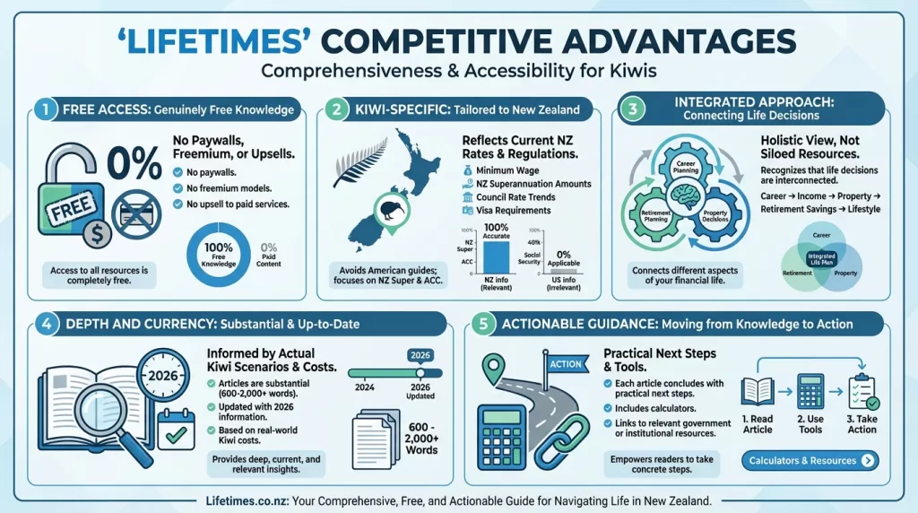- Depth and currency: Articles are substantial (600-2,000+ words), updated with 2026 information, and informed by actual Kiwi scenarios and costs.