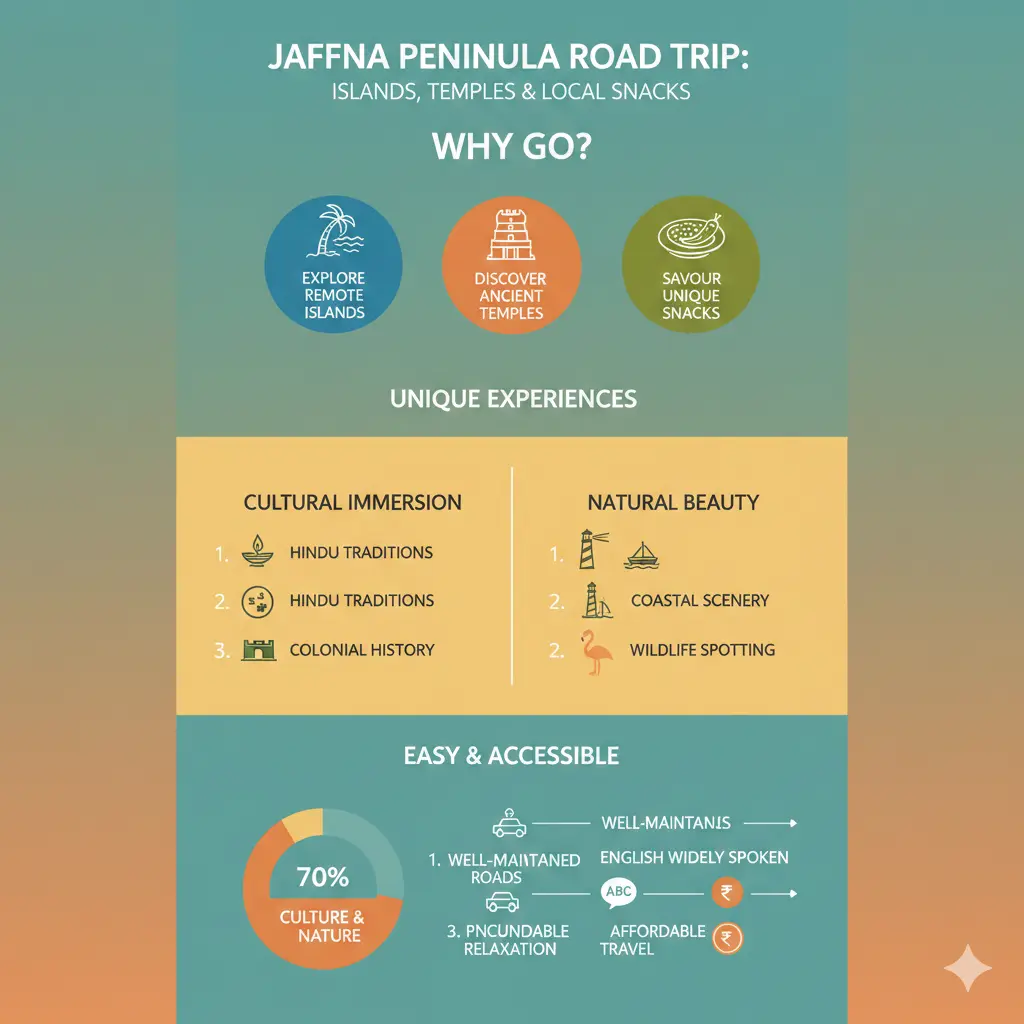 Imagine cruising along the palm-fringed roads of the Jaffna Peninsula, stopping at ancient temples bathed in golden light, hopping on a ferry to wild islands, and savouring crunchy murukku straight from a roadside vendor. That's the essence of a Jaffna Peninsula road trip – a perfect blend of Tamil heritage, stunning coastlines, and irresistible local snacks that ushers us locals back to our roots or introduces the north's magic to friends from Colombo or Kandy.