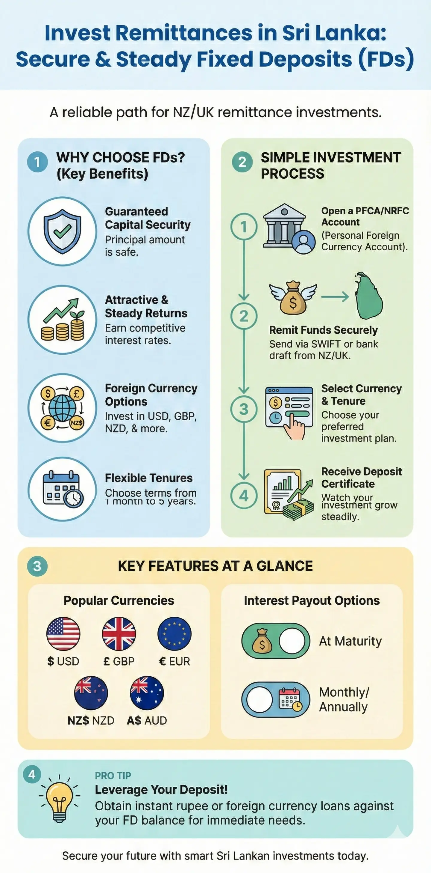 Opening an FD from abroad is straightforward. You will typically need to open a Non-Resident Foreign Currency (NRFC) or a similar account. Once you transfer your funds using a low-cost remittance service, you can instruct the bank to place it in an FD. You can hold your FD in Sri Lankan Rupees (LKR) for a higher interest rate or in a foreign currency (like USD or GBP) to avoid currency value changes.