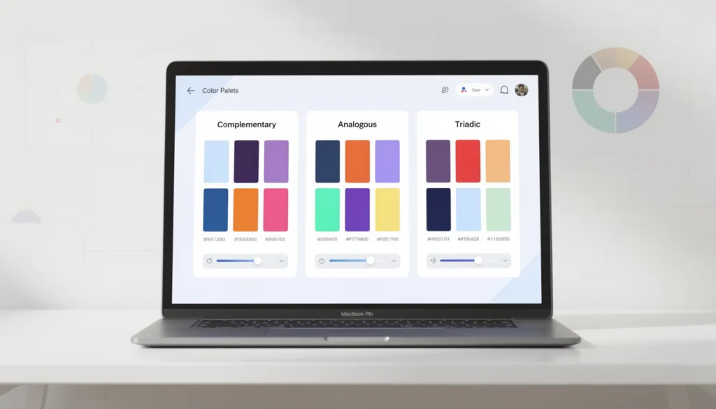 Select your starting color and choose from multiple harmony types including complementary colors that sit opposite each other on the color wheel, analogous colors that sit adjacent for subtle variations, triadic schemes using three evenly spaced colors, split-complementary for high contrast with less tension, tetradic or square schemes using four colors, and monochromatic palettes with variations of a single hue.