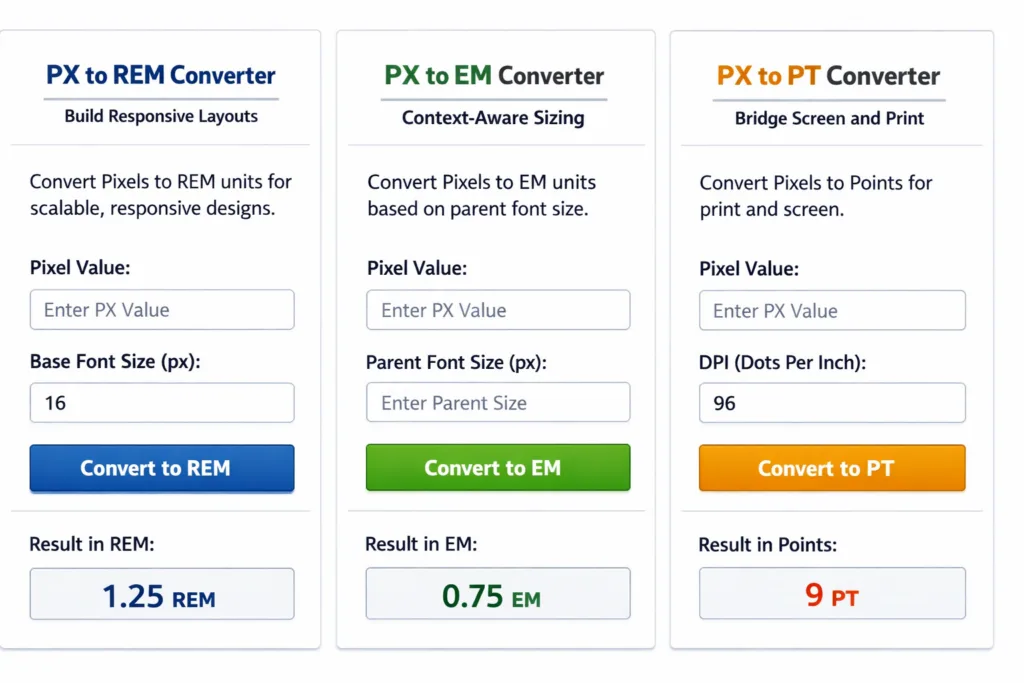Modern responsive design often requires working with multiple unit systems. These converters eliminate manual calculations and potential errors.