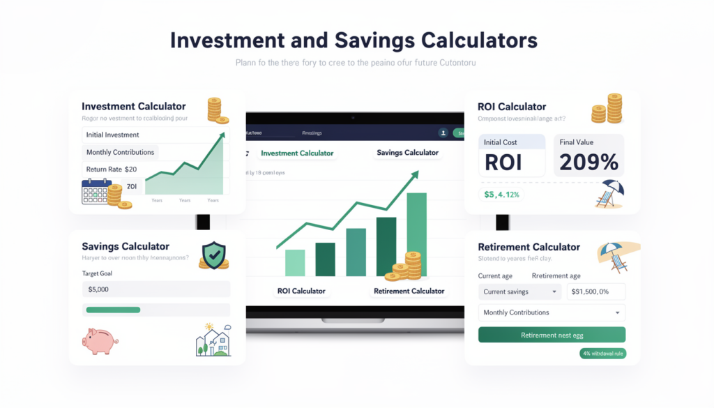 The Investment Calculator projects investment growth with regular contributions. Enter your initial investment, monthly additions, expected return rate, and time horizon.