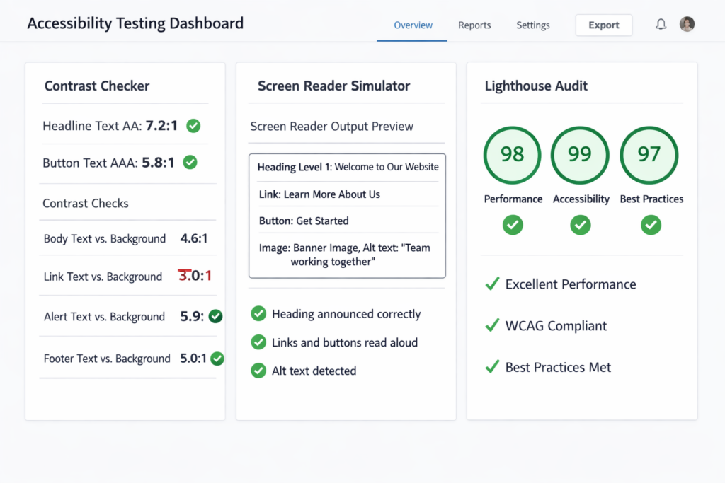 - Contrast and readability: 4.5:1 ratios for text, large tappable links (48px+), and clear focus states for keyboard navigation.diligentic+1โ