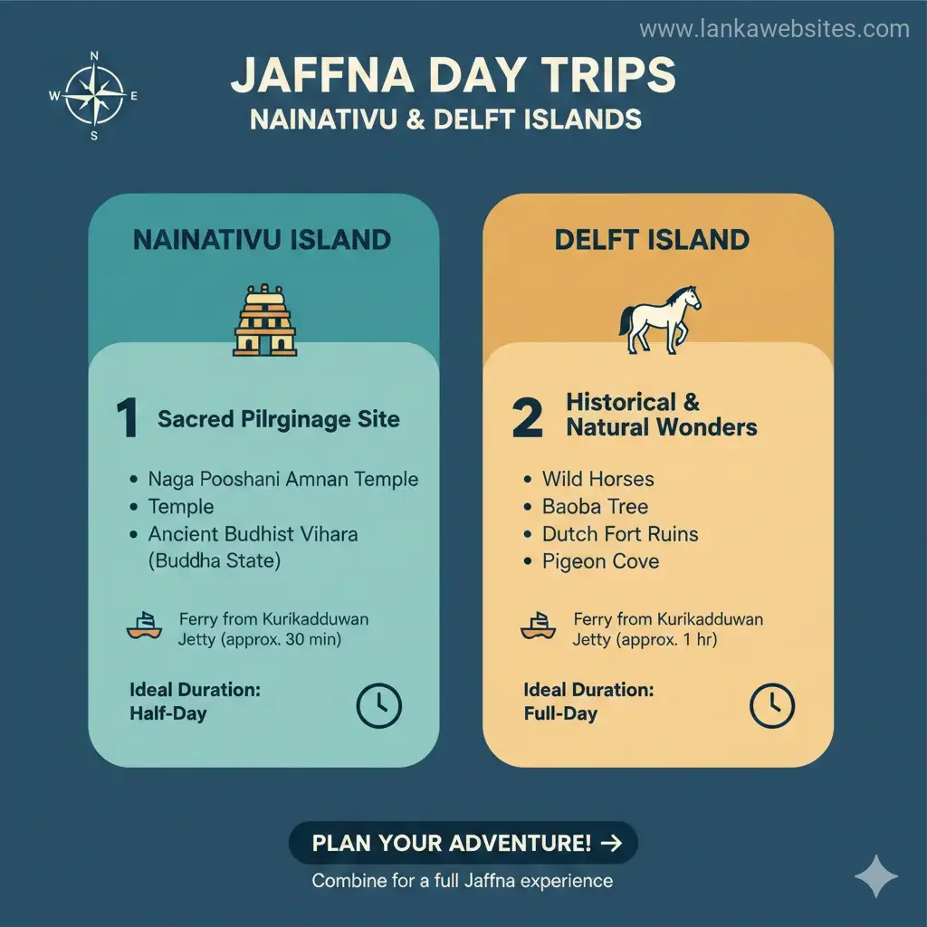 Nainativu and Delft Islands are two hidden gems off the coast of Jaffna Peninsula, offering a unique and exciting day trip experience. From the ancient temples and ruins to the stunning natural beauty and delicious seafood, there's something for everyone on these two enchanting islands. By following our practical advice and tips, you'll be well on your way to a safe and enjoyable trip.