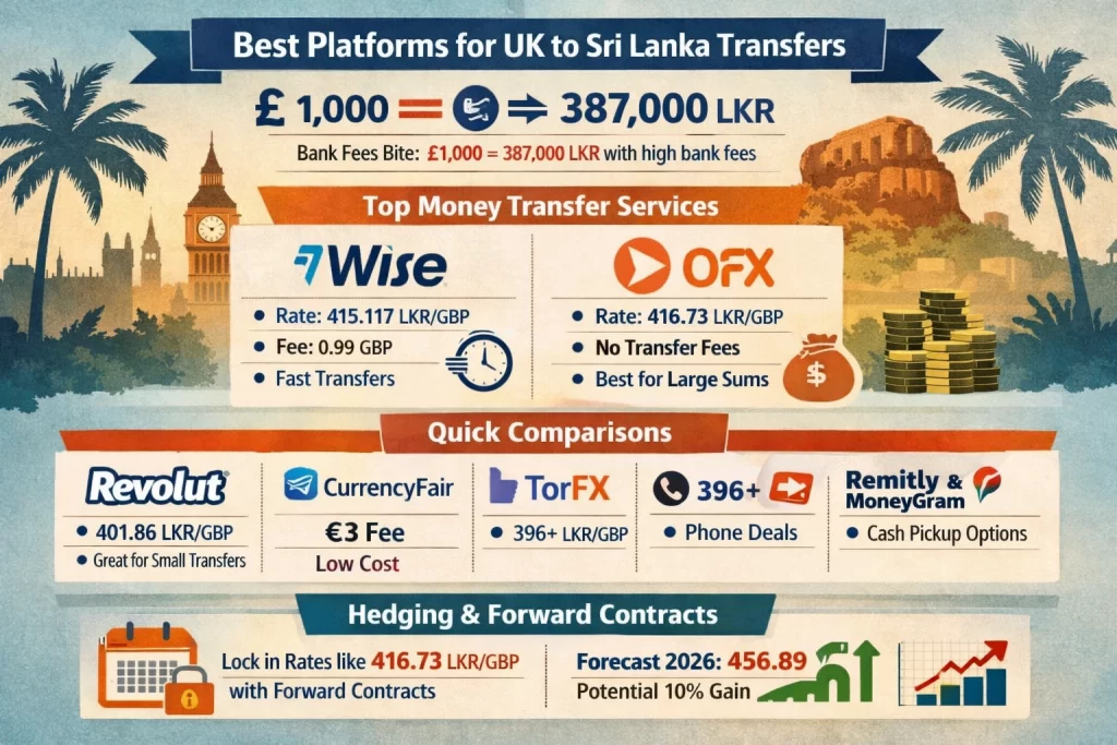 Here’s the part most people miss. You skip those traps by switching to specialist platforms that deliver near mid-market rates—think 415-419 LKR per GBP as seen in early January 2026—without the airport or branch gouge[2]. Wise and OFX lead here, consistently beating banks by offering rates like 415.117 LKR per GBP for Wise or 416.73 LKR customer rates from OFX[3][4][5].