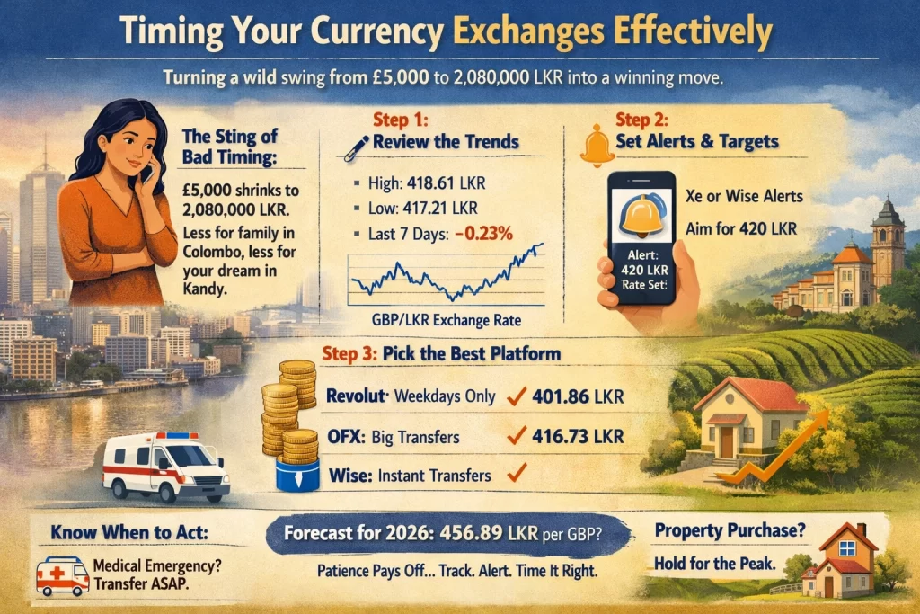 Start by timing your conversions around weak LKR periods, when the rupee dips against the pound. Look at early 2026 data: GBP/LKR hit a low of 414.68 on January 12 after peaking at 419.26 on January 6, a 1.1% swing in days. Set rate alerts on Wise, which tracks historical highs like 419.4710 LKR per GBP on January 6.[3] I once advised a client holding £20,000; waiting one week through that dip netted an extra 100,000 LKR—enough for a month’s groceries. Forecasts show GBP strengthening to 456.89 LKR by year-end, so hold GBP longer if sending to Sri Lanka.