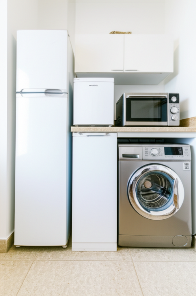 - Measure width, depth, and height of available spaces (kitchen corner, under-counter area, balcony or bathroom for washer).